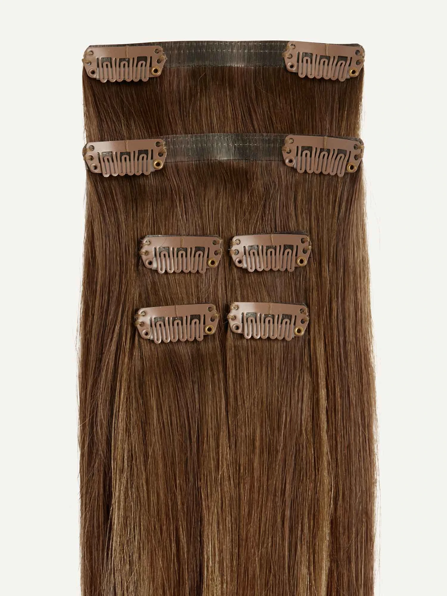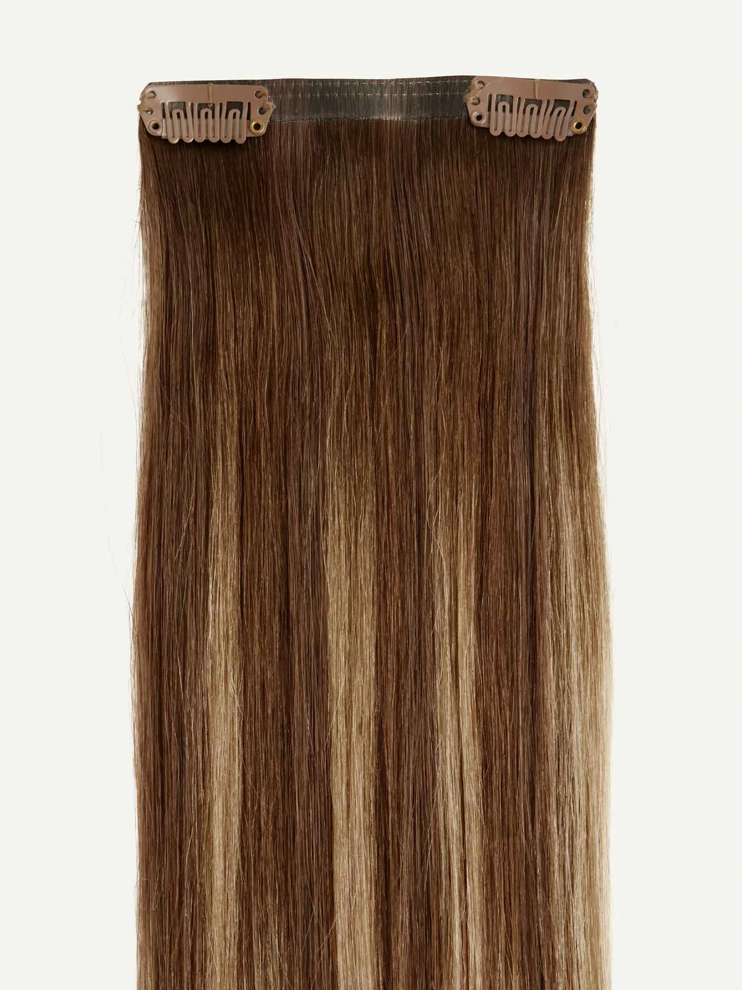 A Chestnut Brown base blended with painted Dirty Blonde highlights, warm golden hues create a sun-kissed effect.