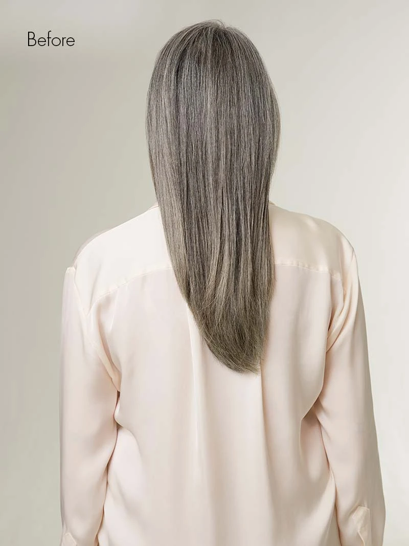 A light gray base with medium gray strands, this warm-toned greige salt and pepper shade lets you get back to your roots.