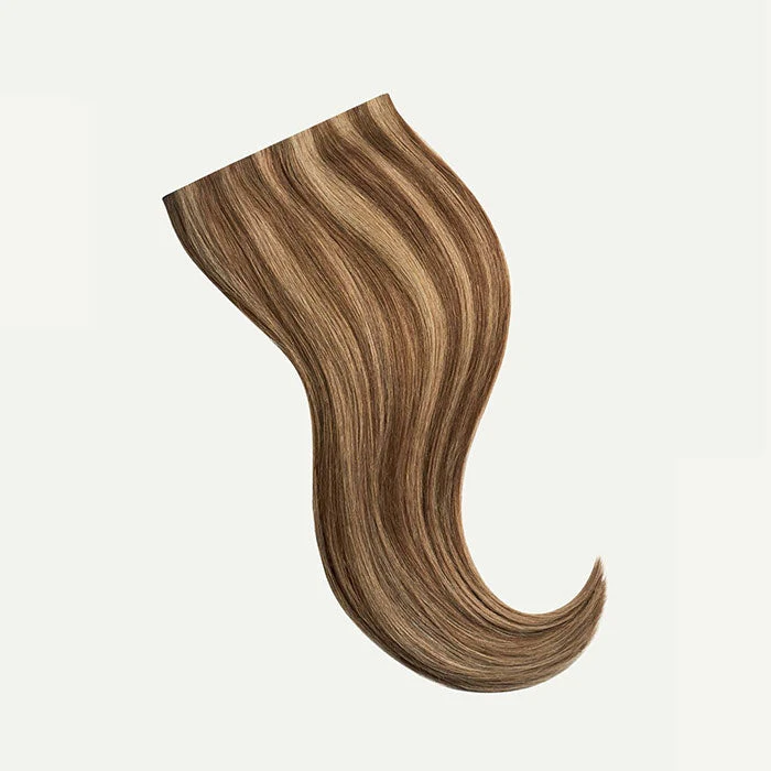 Best suited for highlighted, short or thick hair, this Volume Bundle includes a full 10-piece Classic set and a single, Seamless 4-clip Volumizer weft totalling 200 grams. Chestnut Brown Highlights is a Chestnut Brown base with Dirty Blonde highlights, warm golden hues create a multi-dimensional effect.