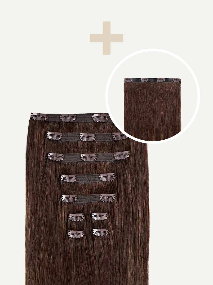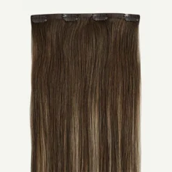 Best suited for short hair, thick hair, or a blunt cut, this Volume Bundle includes a full 10-piece Classic set and a single, Seamless 4-clip Volumizer weft totalling 200 grams. A Chocolate Brown base blended with painted Chestnut Brown highlights, warm golden hues and rich browns create a sun-kissed effect.