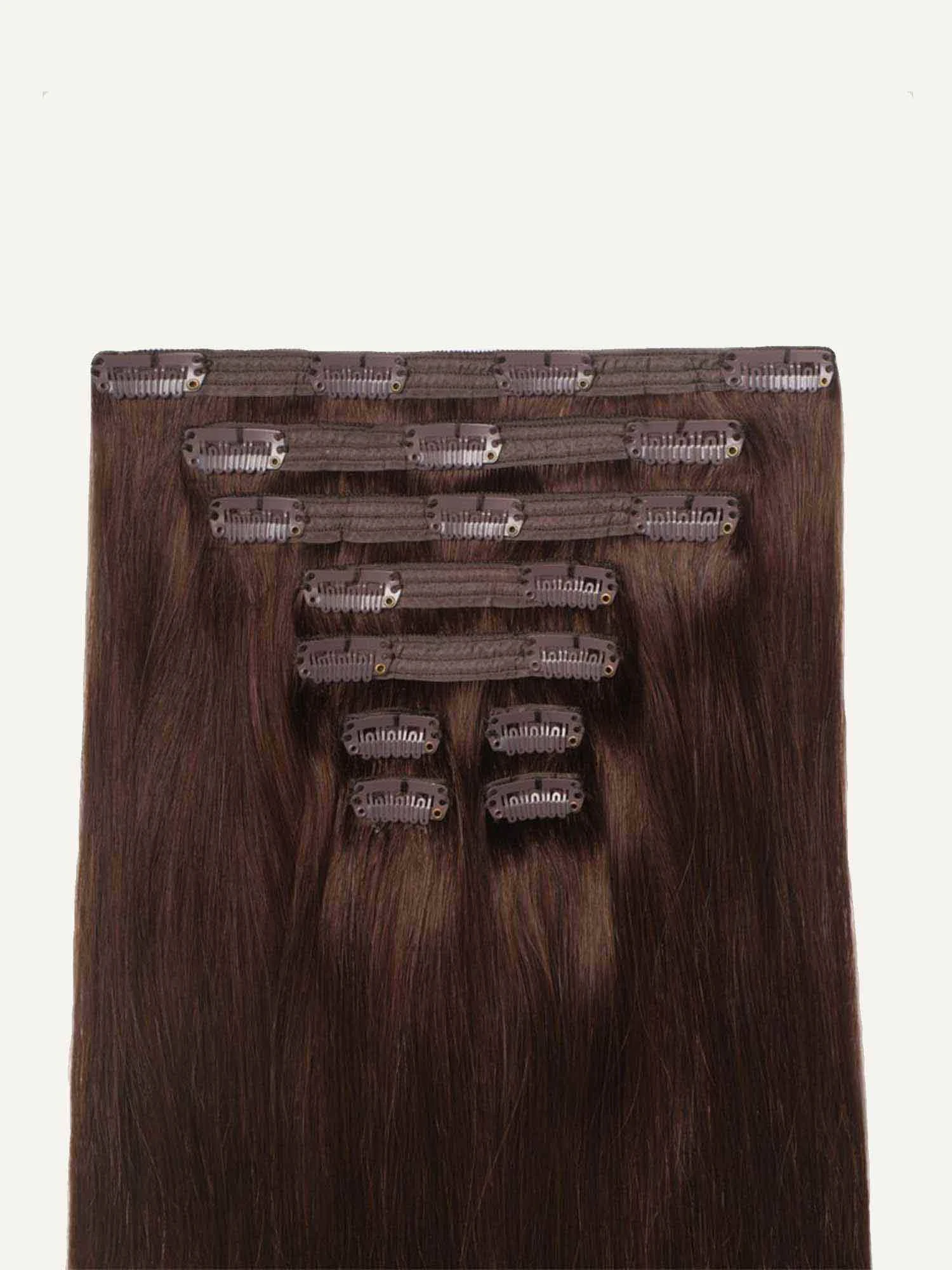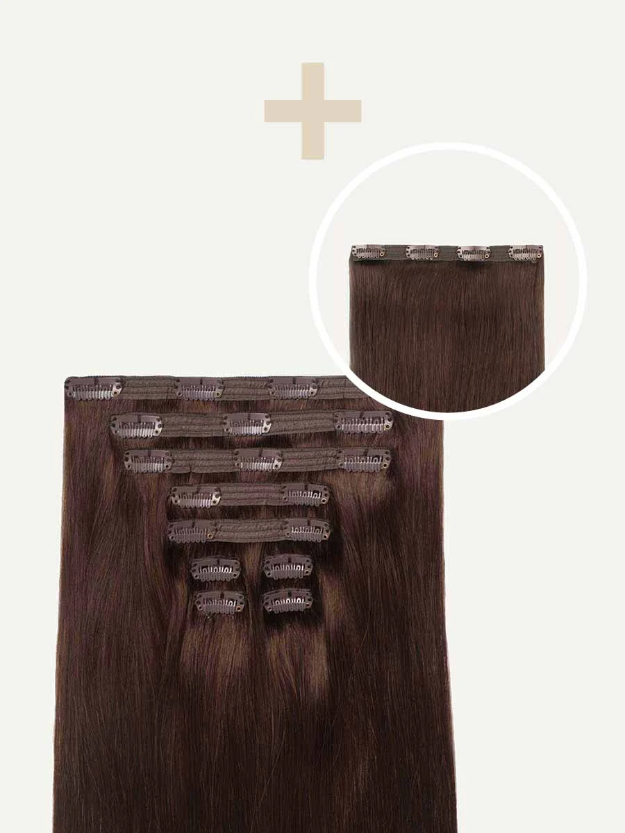 Best suited for fine hair, mid-length hair, or short hair, this Bundle includes a full 10-piece set and a single 4-clip Classic Volumizer Weft totaling 200 grams. A combination of red and golden undertones are baked into this rich and decadent, dessert-inspired shade.