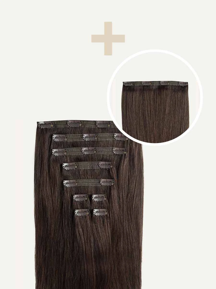 Best suited for fine hair, mid-length hair, or short hair, this Bundle includes a full 10-piece set and a single 4-clip Classic Volumizer Weft totaling 200 grams. A dark brown shade with ashy, cool undertones, it’s Dark Brown’s cooler-toned sister.