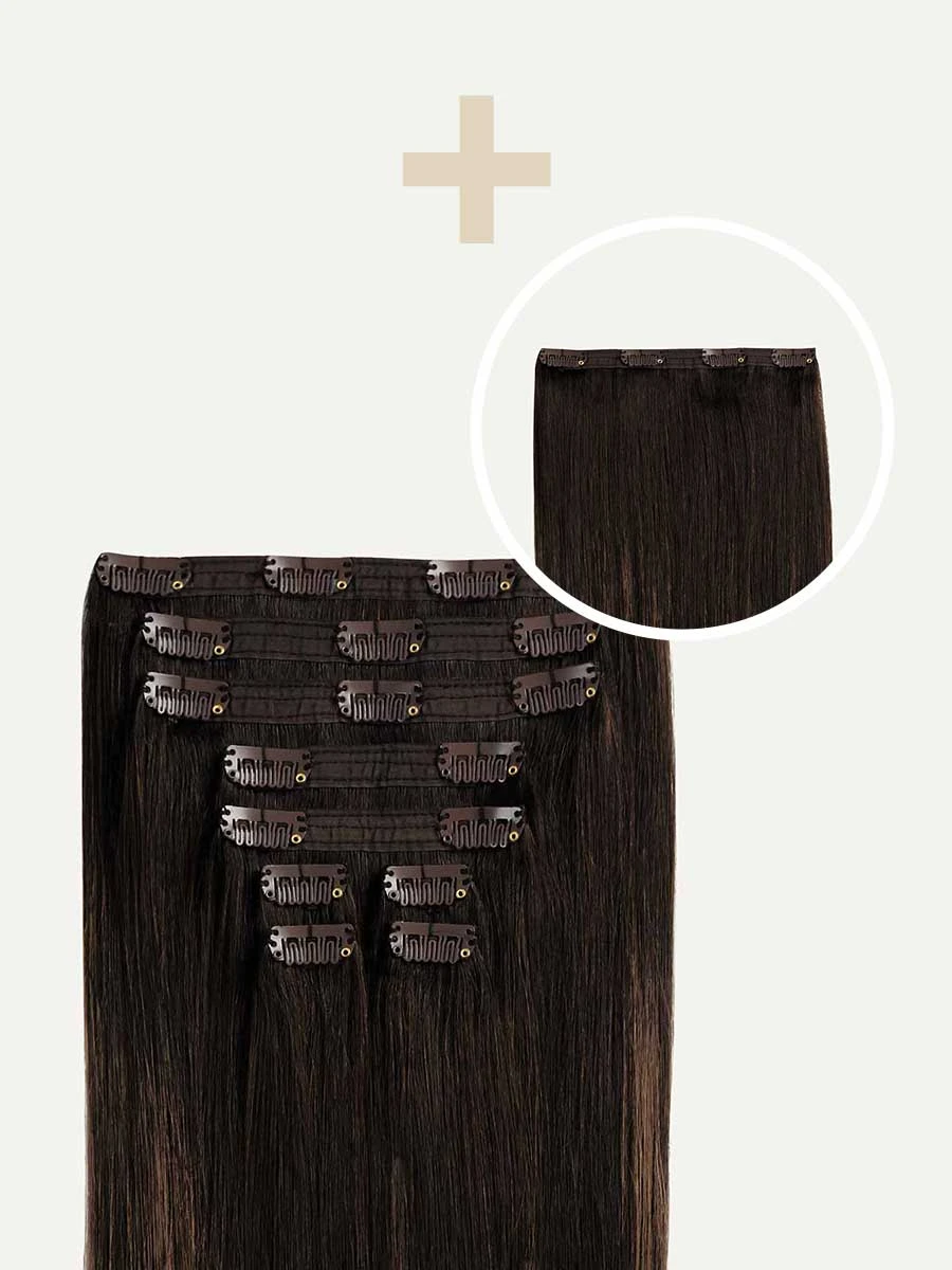 Best suited for short hair, thick hair, or a blunt cut, this Volume Bundle includes a full 10-piece Classic set and a single Seamless 4-clip Volumizer weft totaling 200 grams. A Mocha Brown base blended with painted with Chestnut Brown highlights, warm golden hues create a sun-kissed effect.