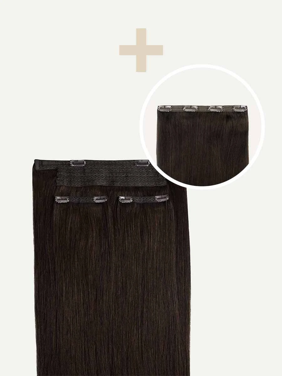 Best suited for short hair, very thick hair, or a blunt cut, this Volume Bundle includes a Halo set and a single 4-clip Classic Volumizer weft totaling 180 grams. A combination of warm and cool undertones come together in this rich, mid-tone brown shade.