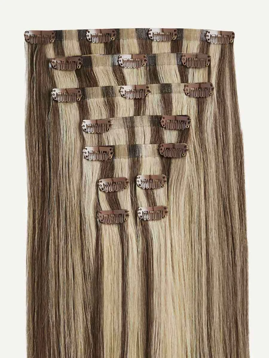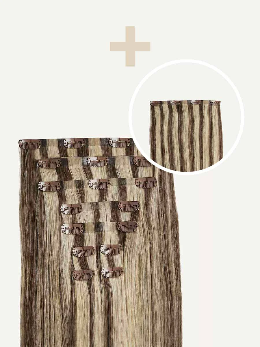 Best suited for highlighted, short or thick hair, this Volume Bundle includes a full 9-piece set and a single, Seamless 4-clip Volumizer weft totaling 200 grams. An Ash Brown base with Sandy Blonde highlights, a mixture of cool hues create a multi-dimensional effect. Best suited for highlighted hair.