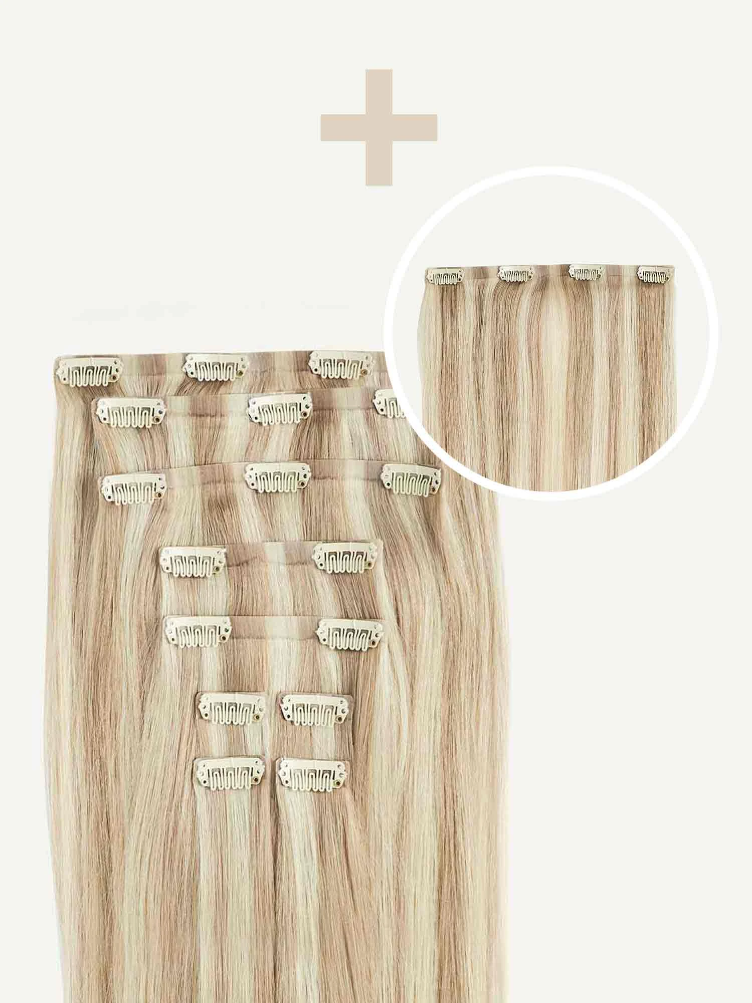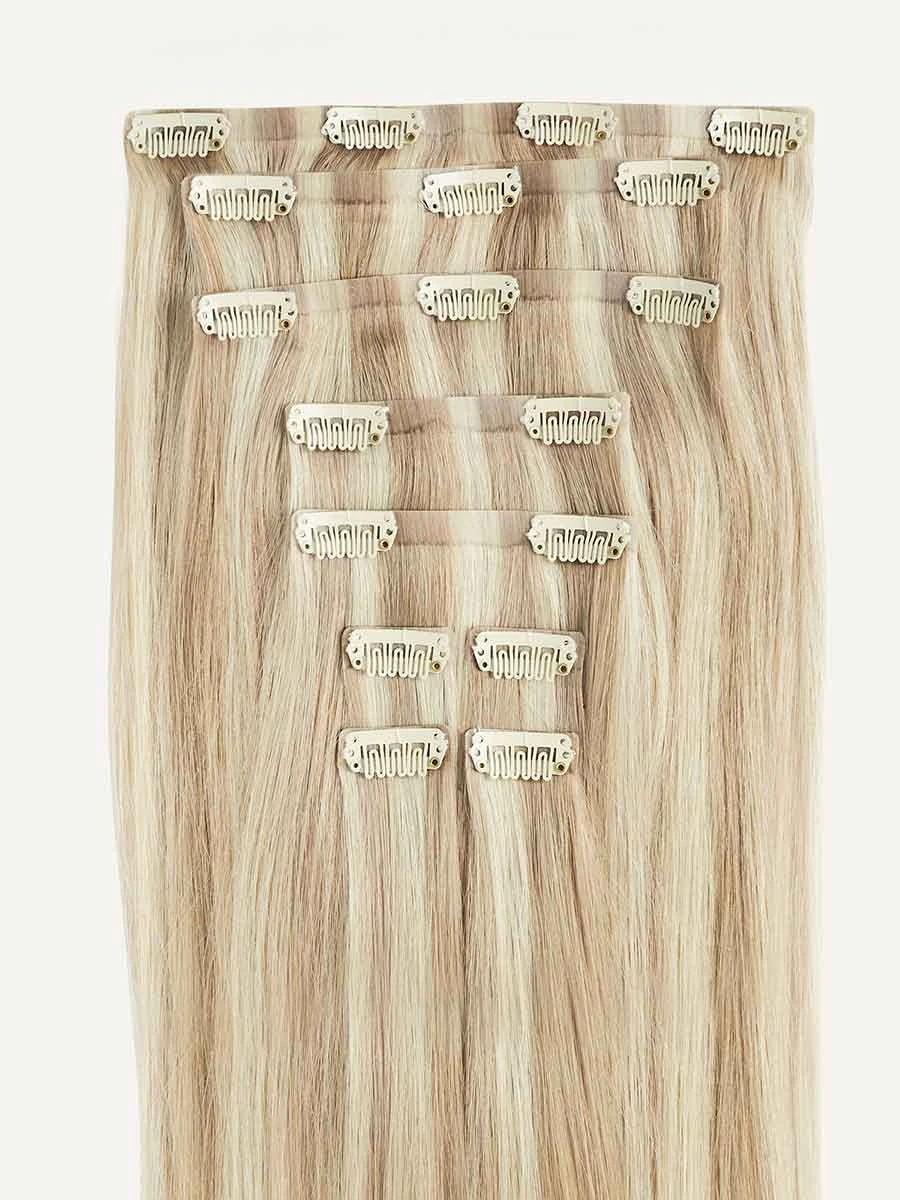 Best suited for fine hair, mid-length hair, or short hair, this Bundle includes a full 10-piece seamless set and a single 4-clip Seamless Volumizer Weft totalling 200 grams. A Beige Blonde base painted with Platinum Blonde highlights, neutral and cool hues create a sun-kissed effect.