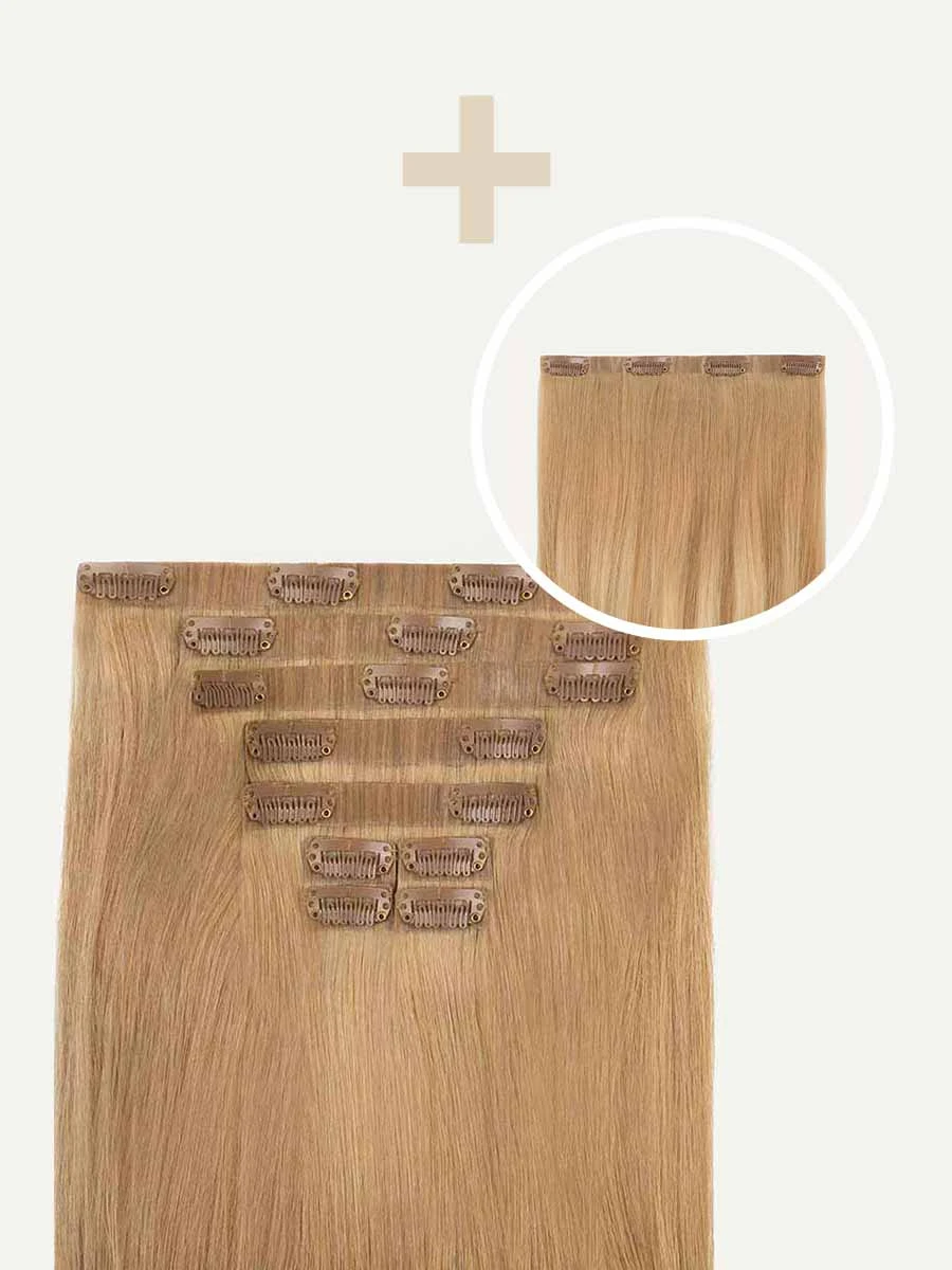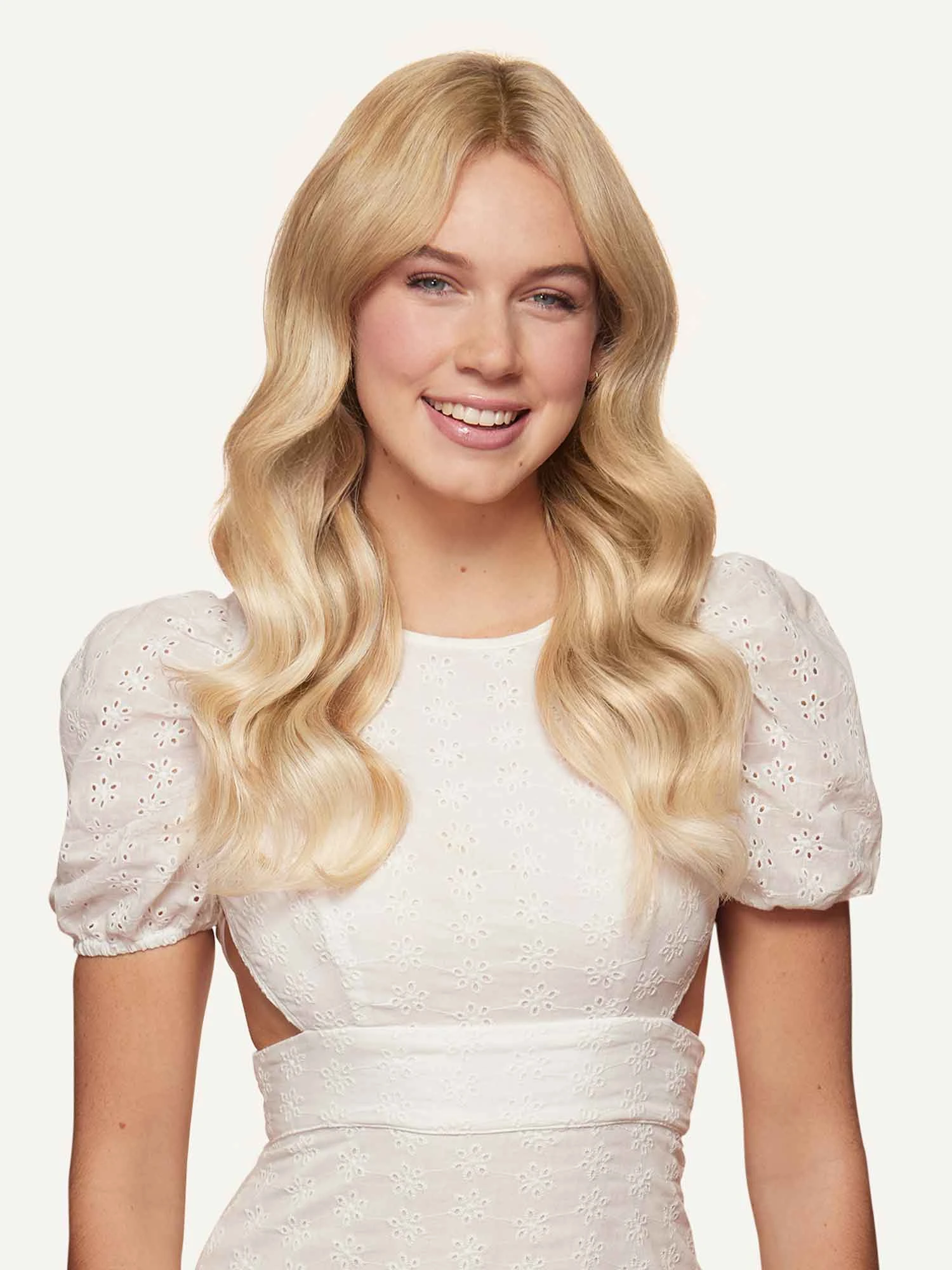 Best suited for short hair, thick hair, or a blunt cut, this Volume Bundle includes a full 9-piece set and a single, Seamless 4-clip Volumizer weft totaling 200 grams. A Dirty Blonde base blended with painted Ash Blonde highlights, cool and warm hues create a sun-kissed effect.
