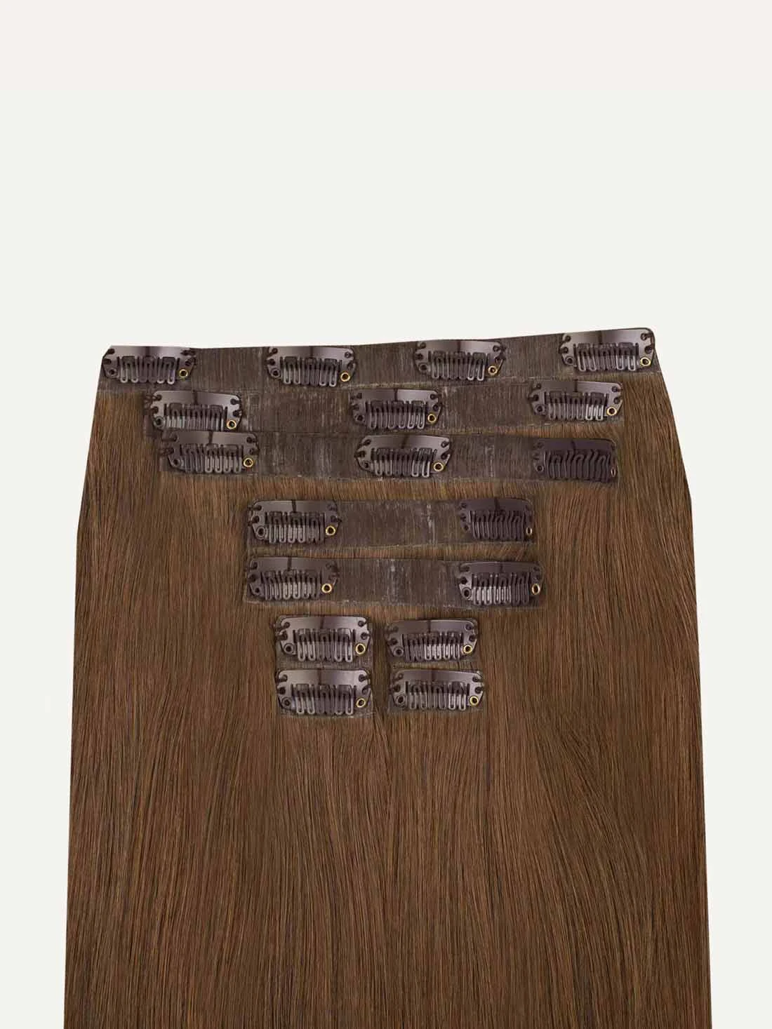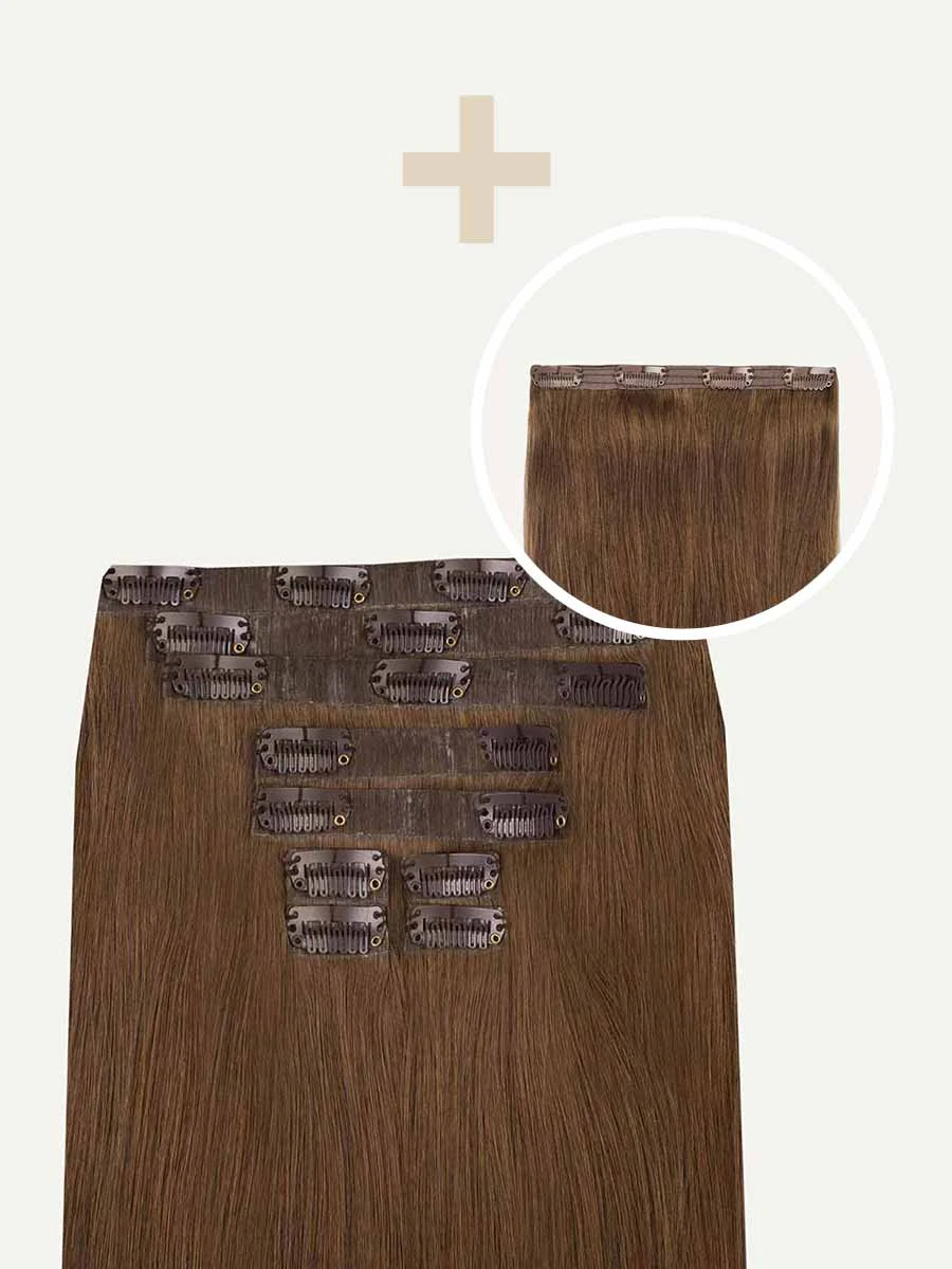 Best suited for fine hair, mid-length hair, or short hair, this Bundle includes a full 10-piece Seamless set and a single 4-clip Classic Volumizer Weft totalling 200 grams. A mixture of warm, golden brown undertones come together in this toasty light brown shade.