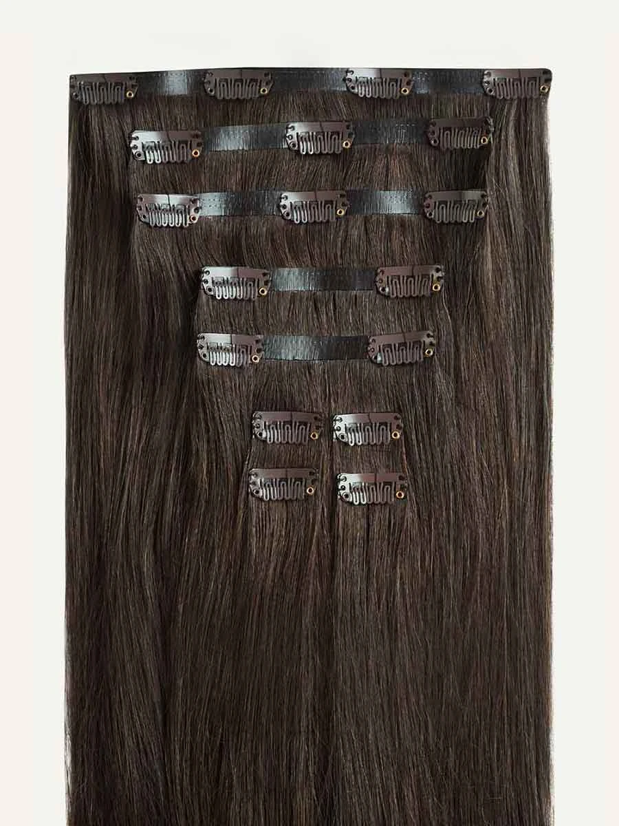 Best suited for fine hair, mid-length hair, or short hair, this Bundle includes a full 10-piece set and a single 4-clip Classic Volumizer Weft totaling 200 grams. A dark brown shade with ashy, cool undertones, it’s Dark Brown’s cooler-toned sister.