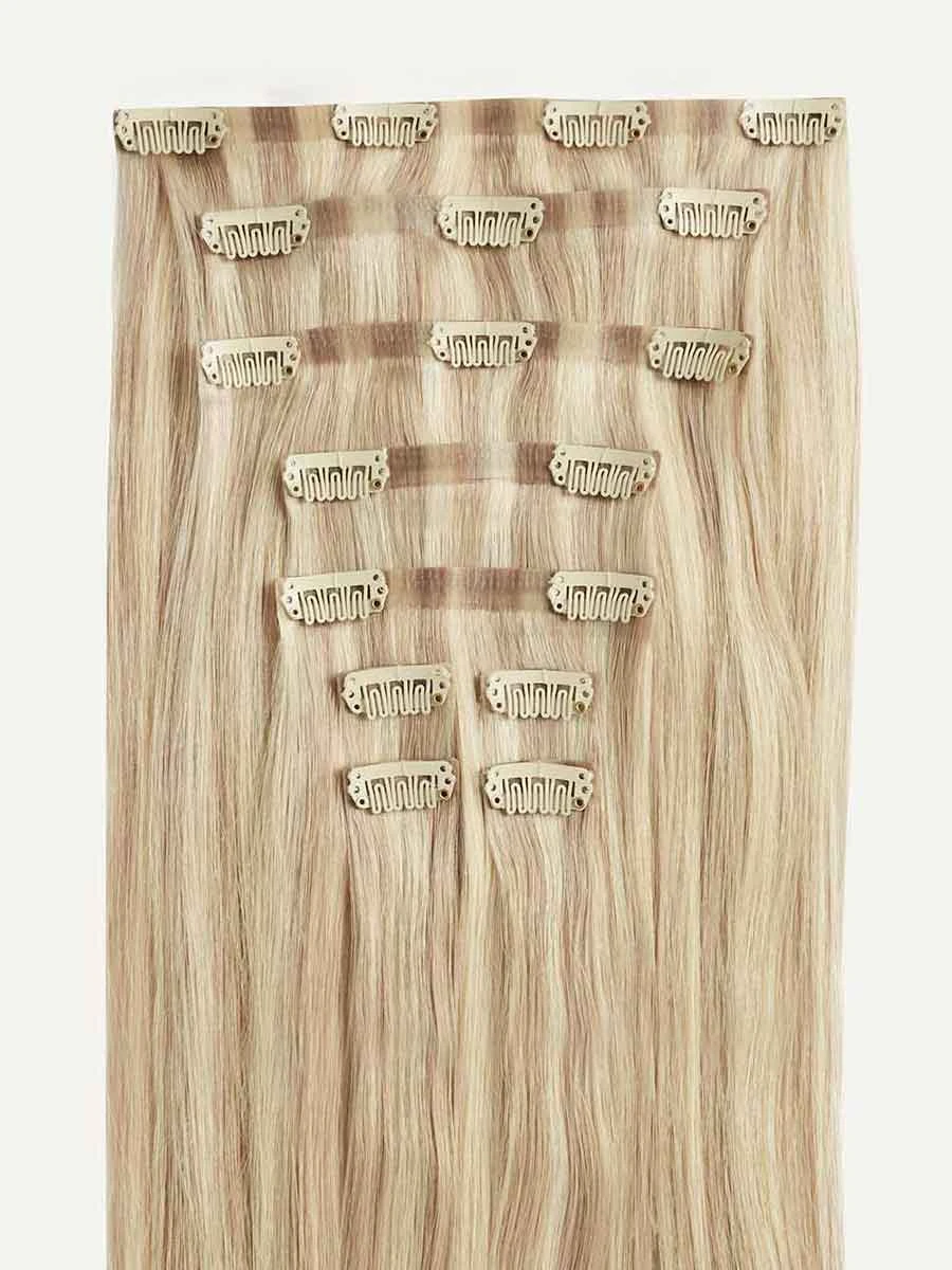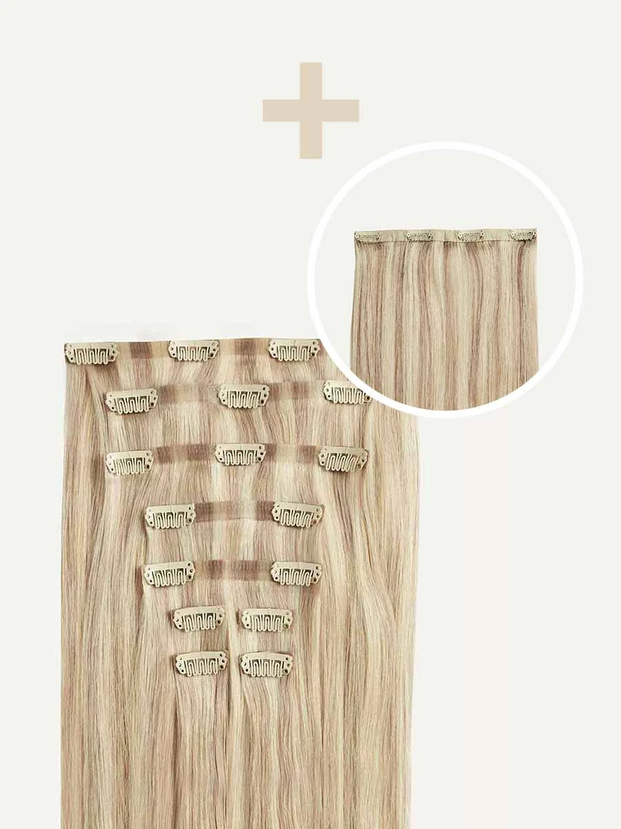 Best suited for fine hair, mid-length hair, or short hair, this Bundle includes a full 9-piece seamless set and a single 4-clip Classic Volumizer Weft totalling 200 grams. A dimensional neutral blonde shade with subtle ash blonde lowlights, it’s Dimensional Cream Blonde’s lighter sister. Formerly known as Beige Blonde.