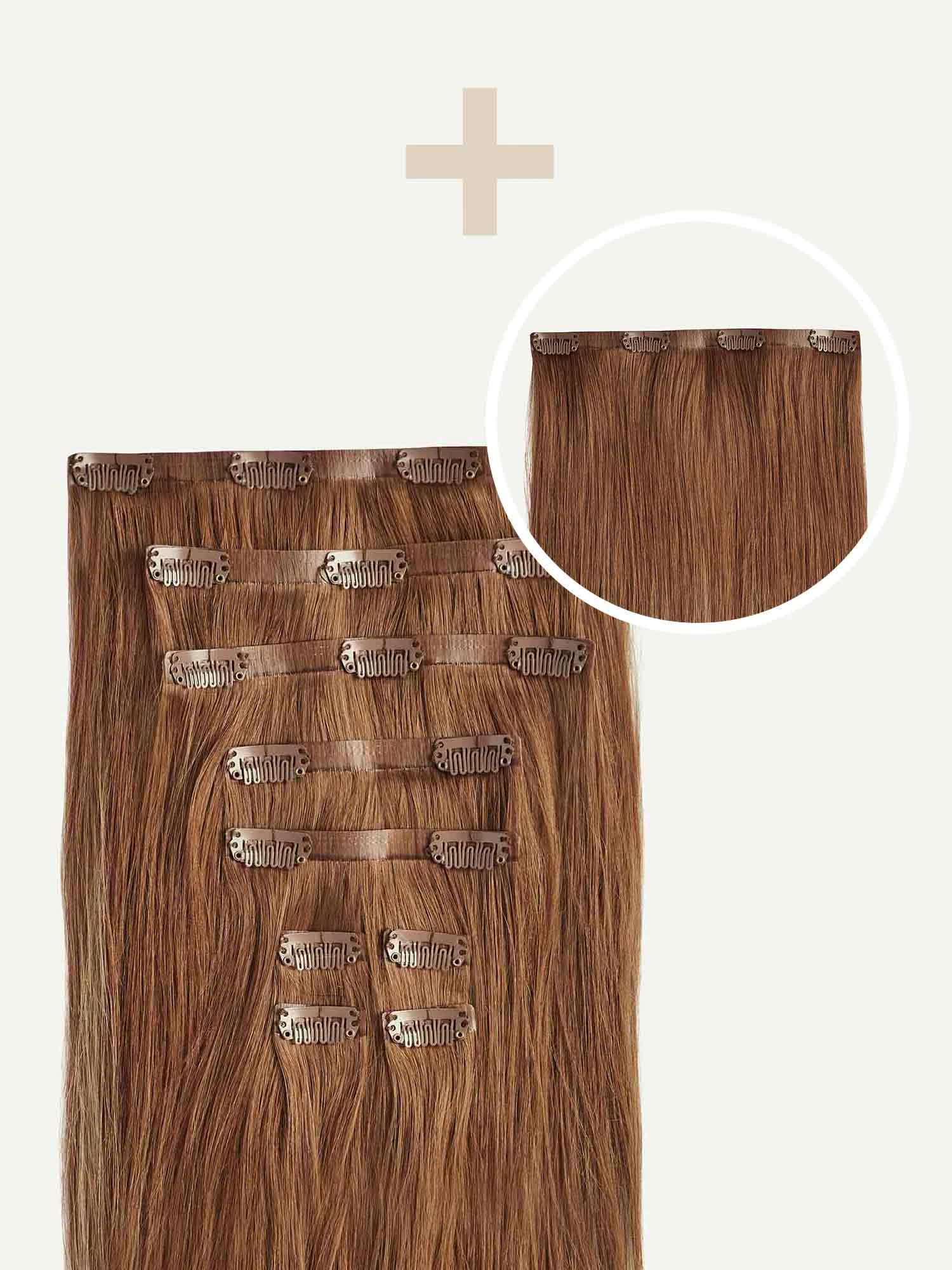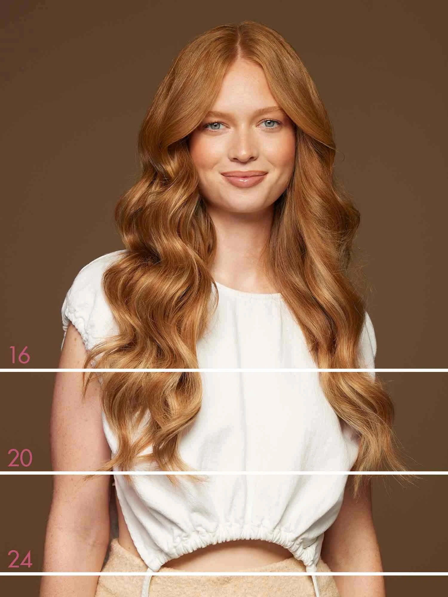 Best suited for fine hair, mid-length hair, or short hair, this Bundle includes a full 10-piece seamless set and a single 4-clip Seamless Volumizer Weft totalling 200 grams. A Natural Red base painted with Dirty Blonde highlights, warm copper hues create a sun-kissed effect.