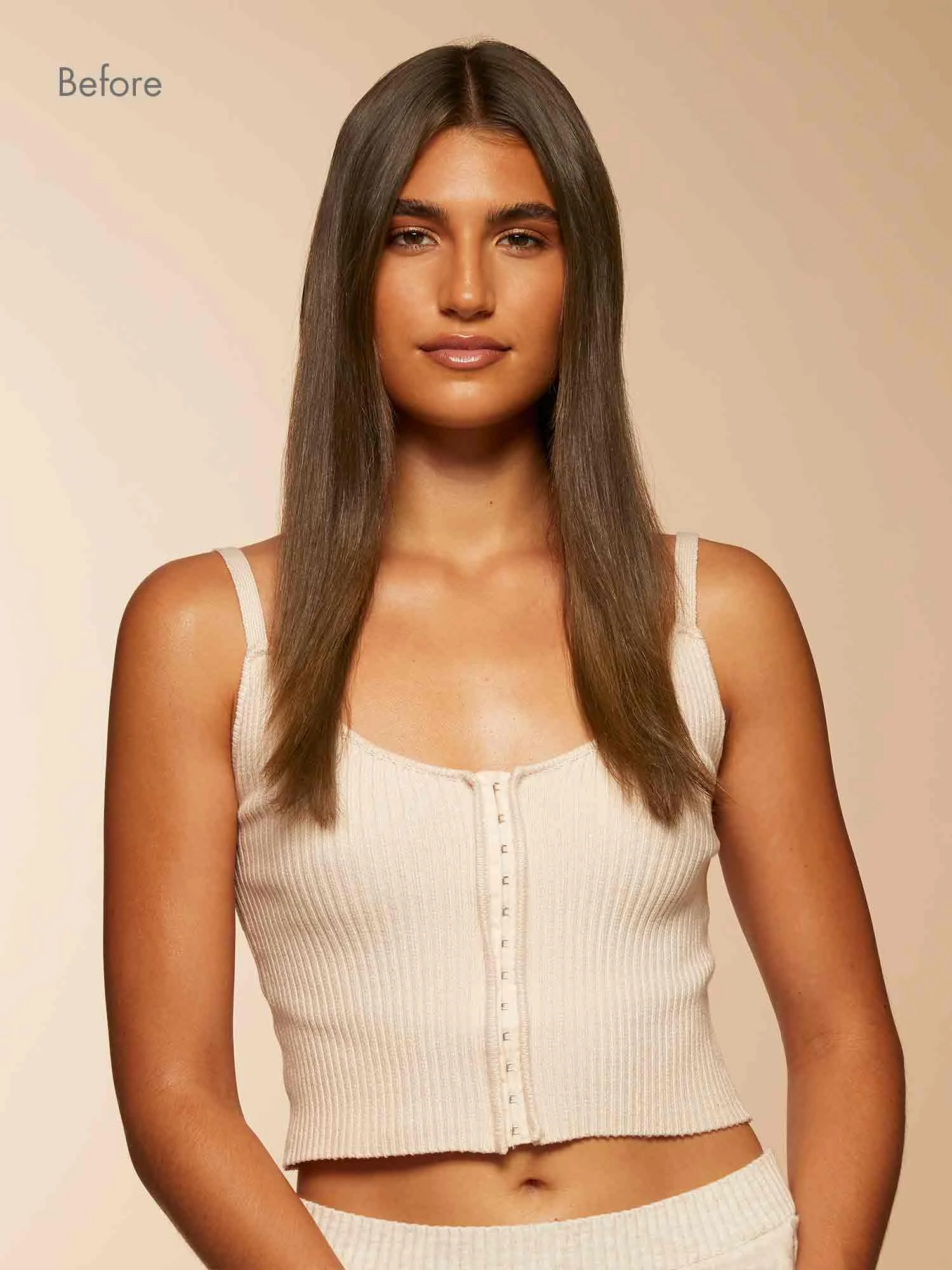 Best suited for fine hair, mid-length hair, or short hair, this Bundle includes a full 10-piece seamless set and a single 4-clip Seamless Volumizer Weft totalling 200 grams. A Neutral Brown base painted with Natural Blonde highlights, neutral and cool hues create a sun-kissed effect.