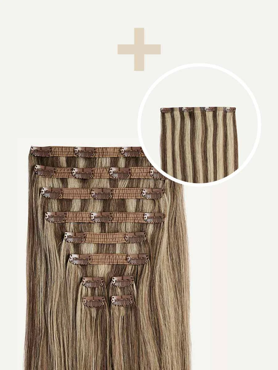 Best suited for highlighted, short or thick hair, this Bundle includes a Classic set and a single 4-clip Seamless Volumizer weft totaling 265 grams. An Ash Brown base with Sandy Blonde highlights, a mixture of cool hues create a multi-dimensional effect. Best suited for highlighted hair.