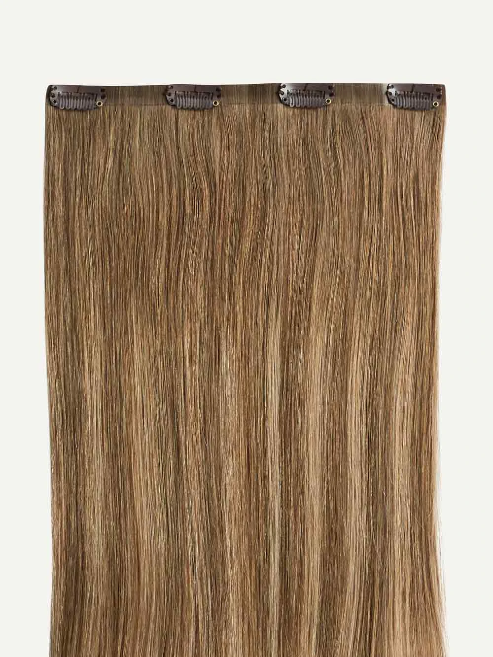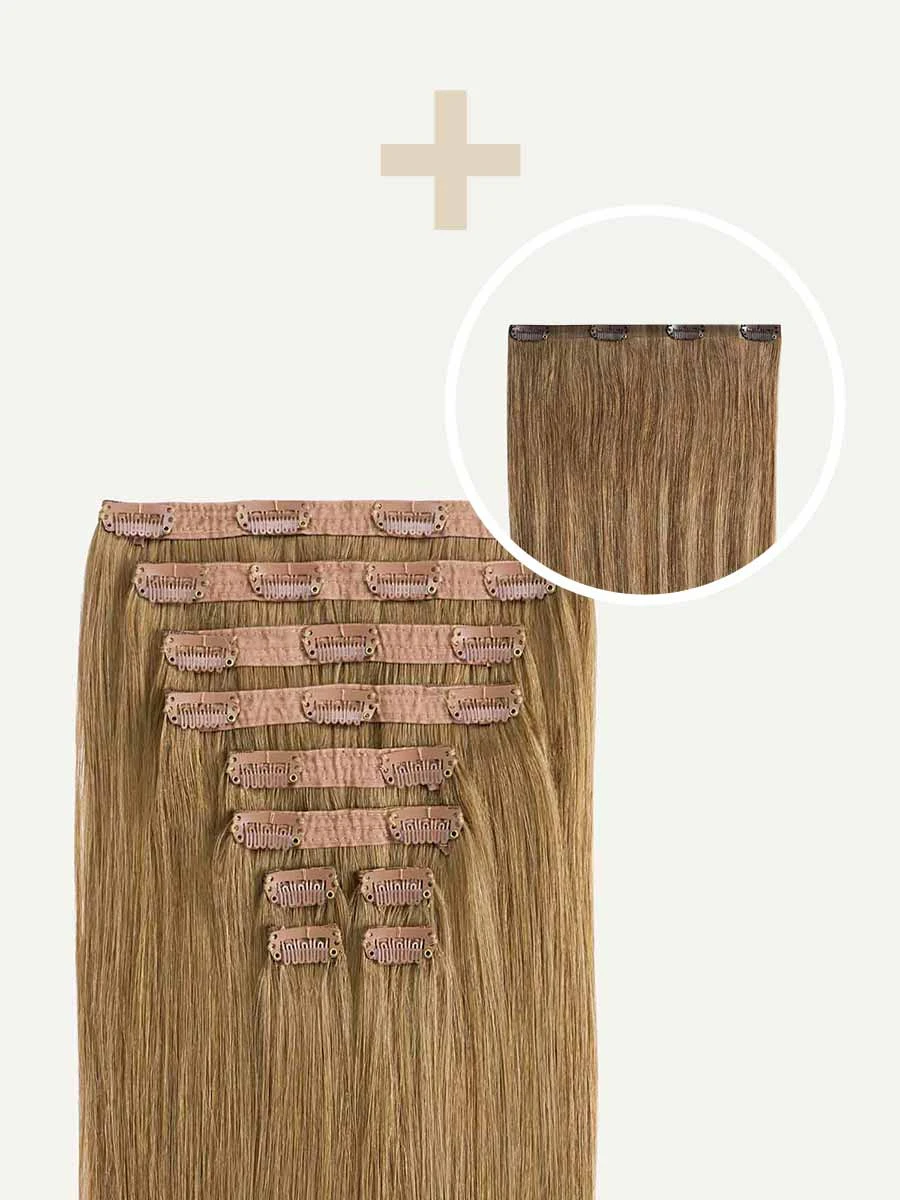 Best suited for short hair, very thick hair, or a blunt cut, this Volume Bundle includes a full 10-piece set and a single 4-clip Seamless Volumizer weft totaling 265 grams. A Bronde base blended with painted Dirty Blonde highlights, warm blonde and brown hues create a sun-kissed effect.