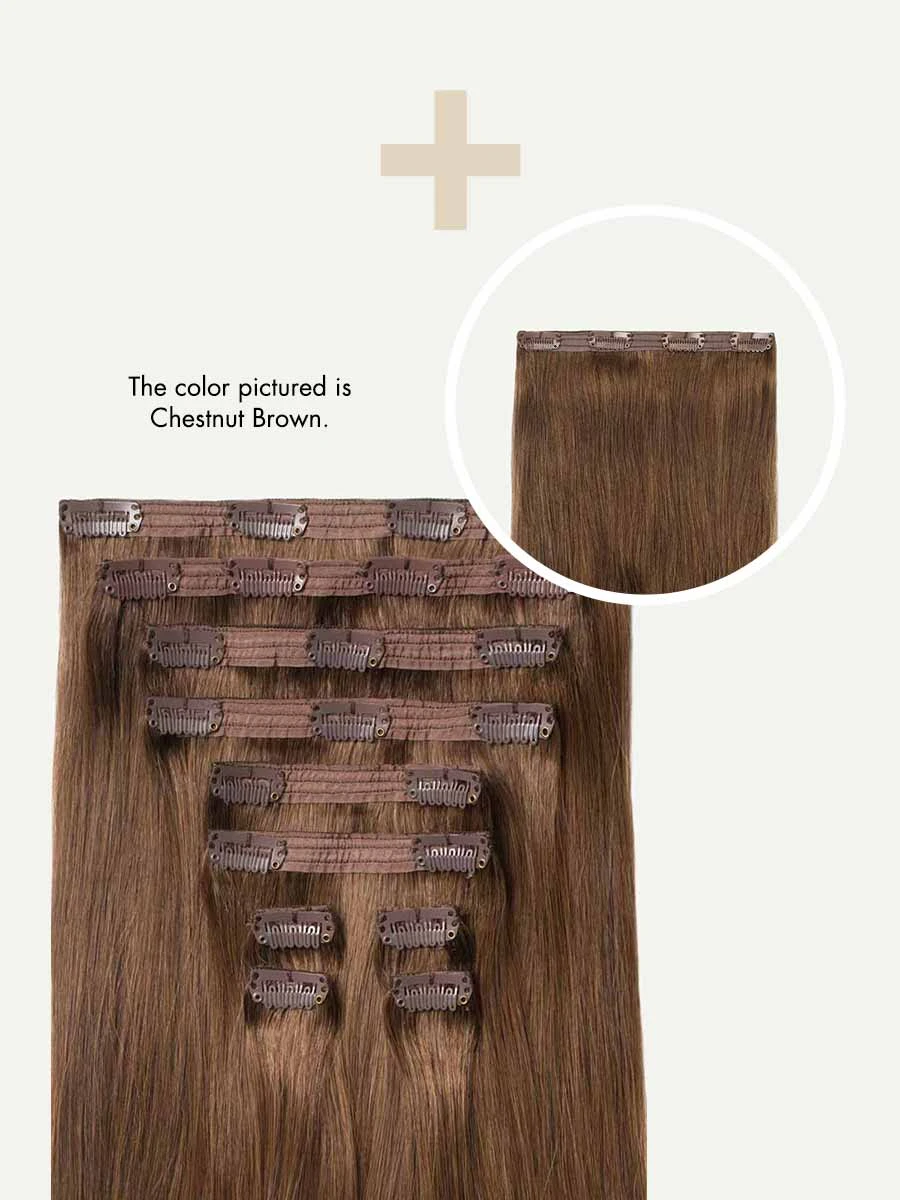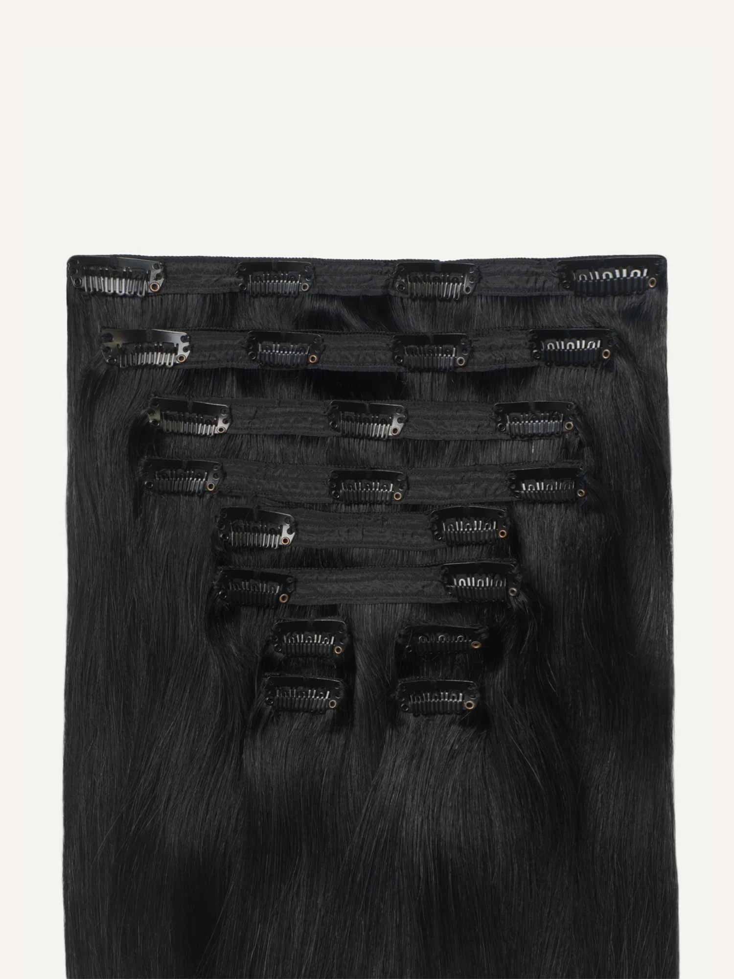 Best suited for short hair, very thick hair, or a blunt cut, this Bundle includes a full 10-piece set and a single 4-clip Volumizer weft totaling 265 grams. Our blackest black, this cool-toned shade has blue undertones throughout for enhanced shine and gloss.