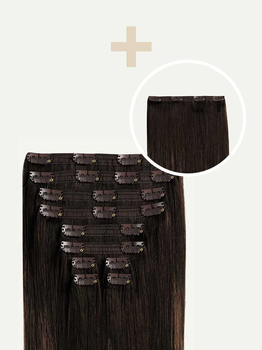 Best suited for short hair, very thick hair, or a blunt cut, this Volume Bundle includes a full 10-piece set and a single 4-clip Seamless Volumizer weft totaling 265 grams. A Mocha Brown base blended with painted with Chestnut Brown highlights, warm golden hues create a sun-kissed effect.