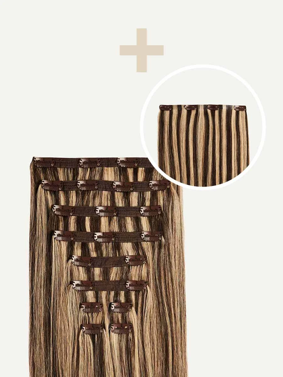 Best suited for highlighted, short or thick hair, this Bundle includes a Classic set and a single 4-clip Seamless Volumizer weft totaling 265 grams. A Mocha Brown base with Dirty Blonde highlights, a mixture of warm hues create a multi-dimensional effect. Best suited for highlighted hair.