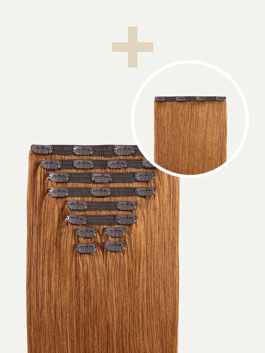 Best suited for short hair, very thick hair, or a blunt cut, this Bundle includes a full 10-piece set and a single 4-clip Volumizer weft totaling 265 grams. A perfect match for most natural redheads, warm copper undertones blend together seamlessly in this true red shade.
