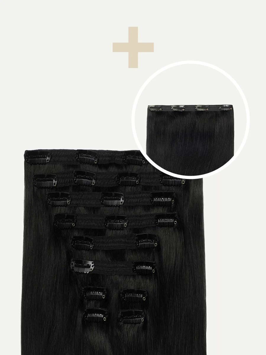 Best suited for short hair, very thick hair, or a blunt cut, this Bundle includes a full 10-piece set and a single 4-clip Volumizer weft totaling 265 grams. A shade that’s just shy of Jet Black, warm brown undertones come together to create depth and complexity.