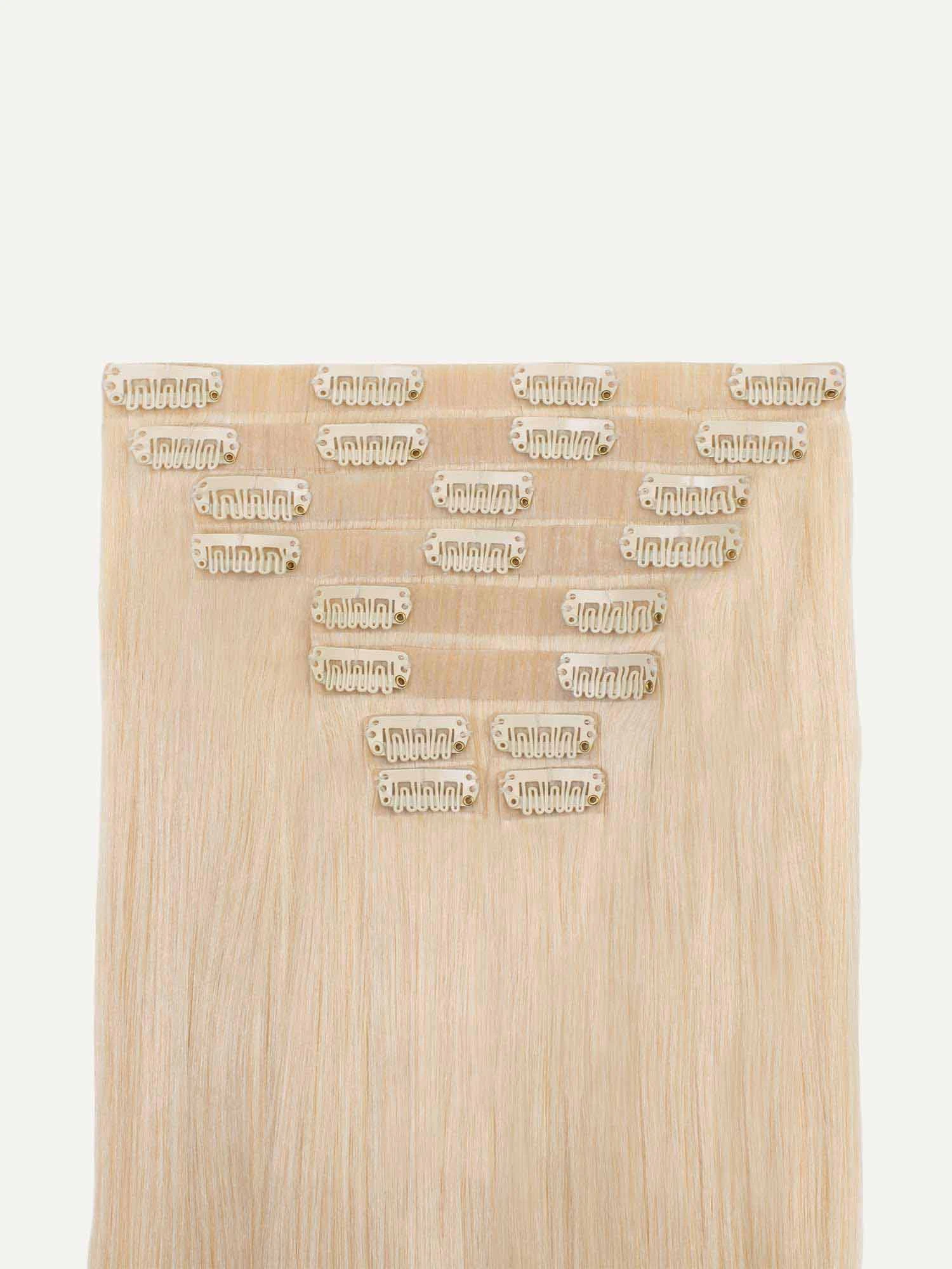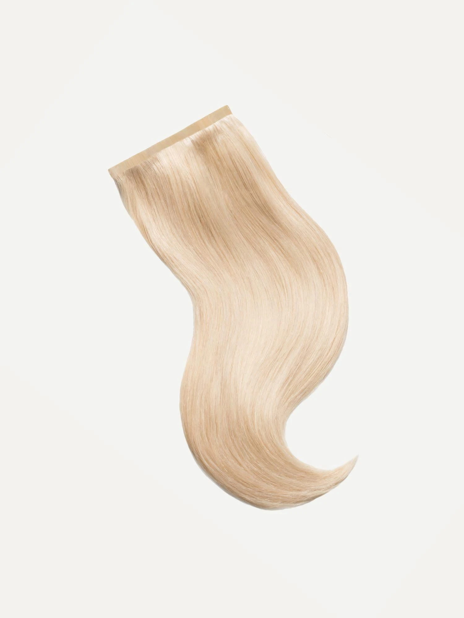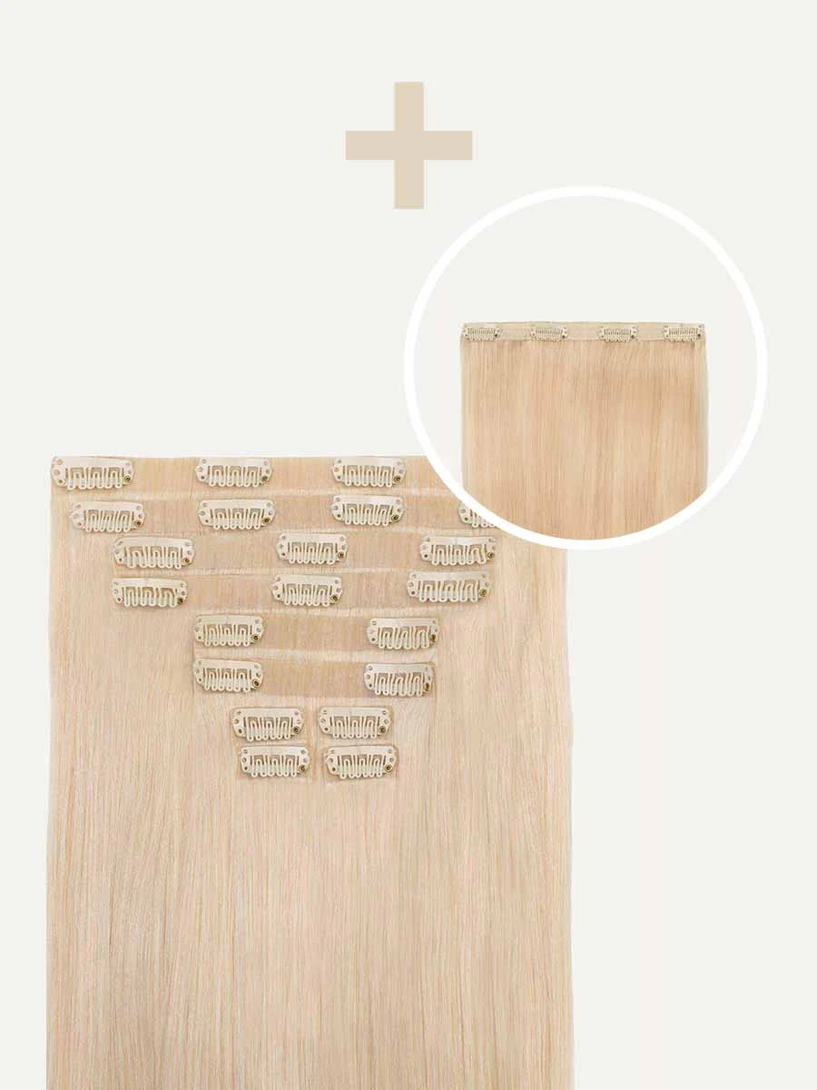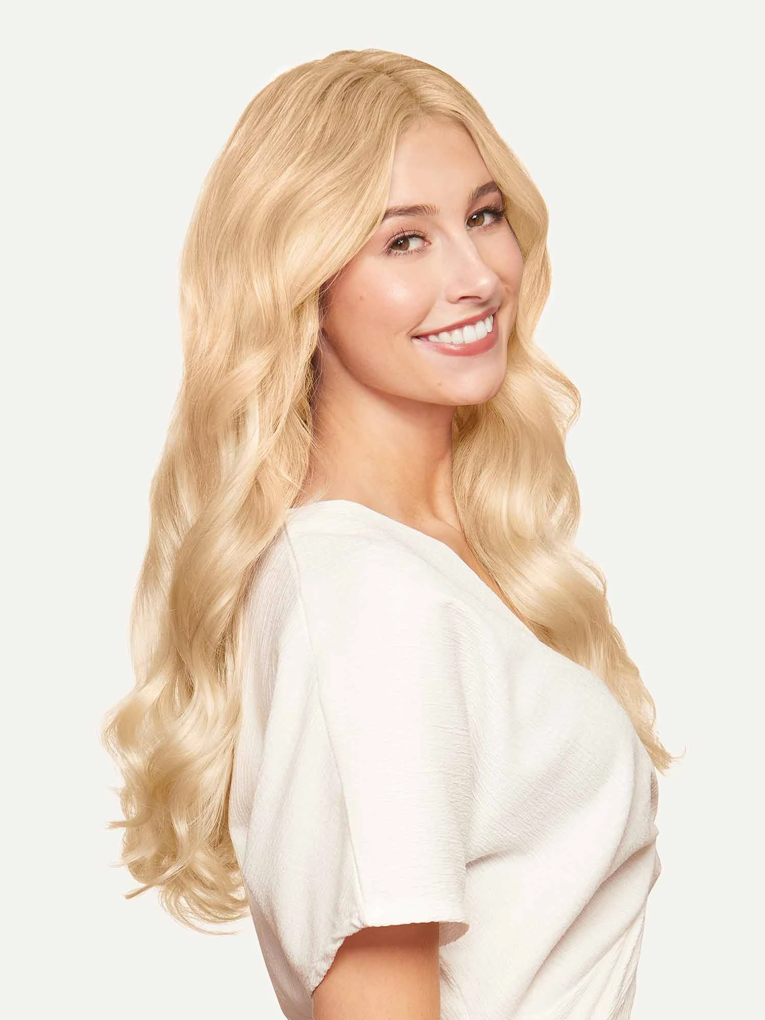 Best suited for short or thick hair, or a blunt cut, this Bundle includes a full 10-piece Seamless set and a single, Classic 4-clip Volumizer weft totaling 225 grams. A light blonde with a balance of ash and golden undertones, it’s your lightest blonde without being completely platinum.
