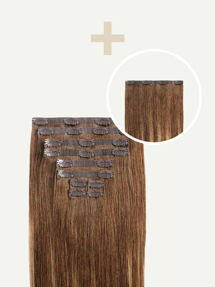 Best suited for short or thick hair, or a blunt cut, this Bundle includes a full 10-piece set and a single 4-clip Volumizer weft totaling 225 grams. A Chestnut Brown base blended with painted Dirty Blonde highlights, warm golden hues create a sun-kissed effect.