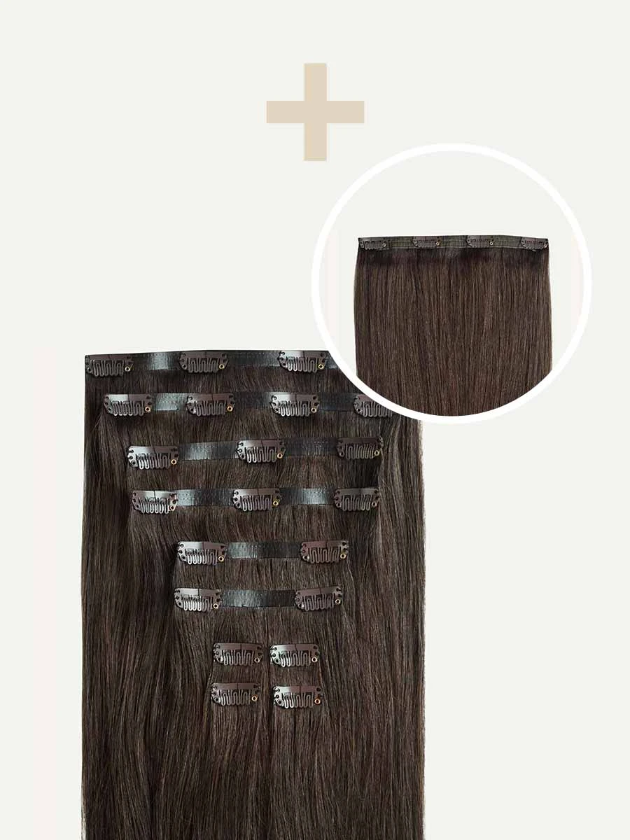 Best suited for short or thick hair, or a blunt cut, this Bundle includes a full 10-piece set and a single 4-clip Volumizer weft totaling 225 grams. A dark brown shade with ashy, cool undertones, it’s Dark Brown’s cooler-toned sister.