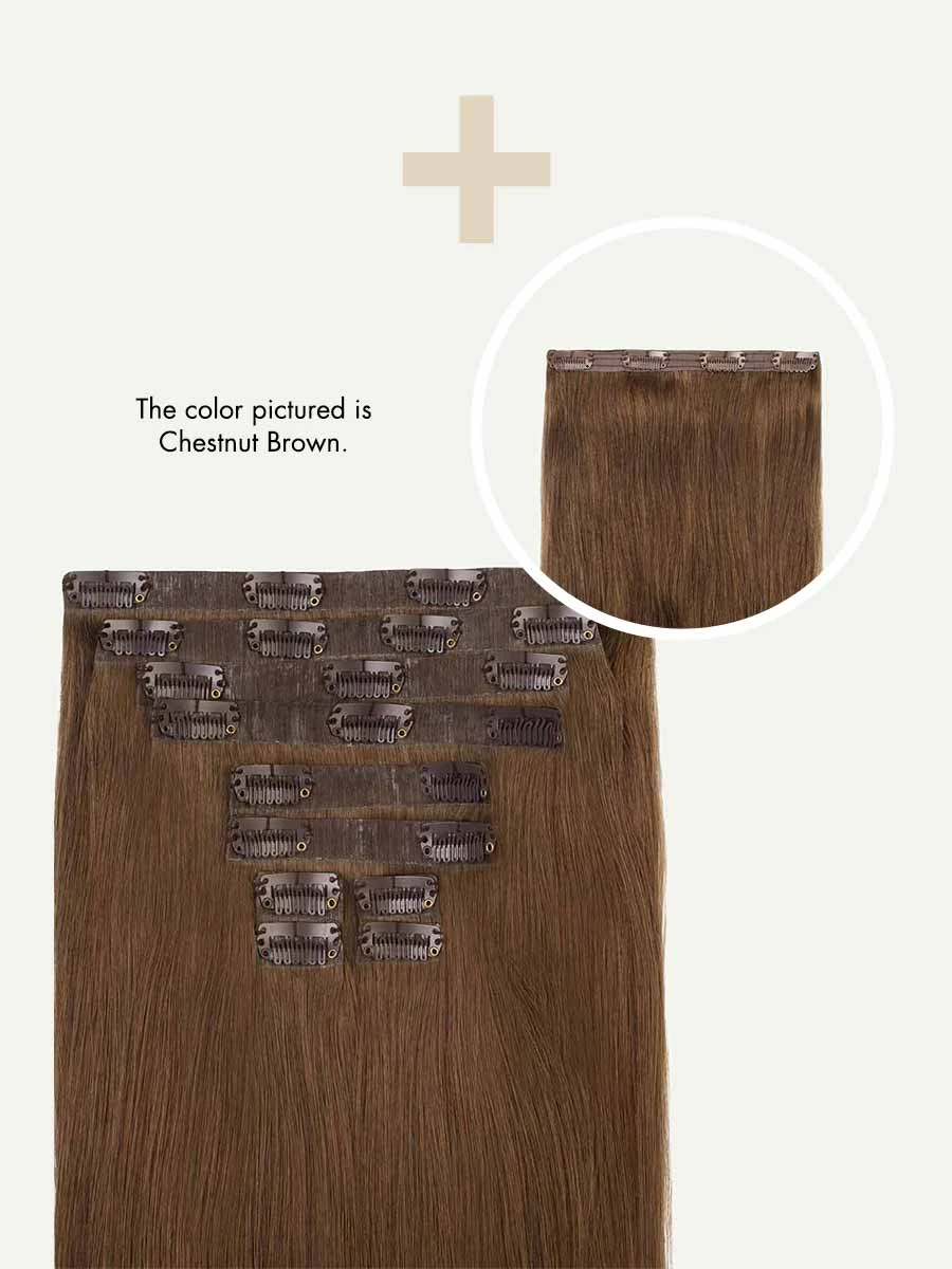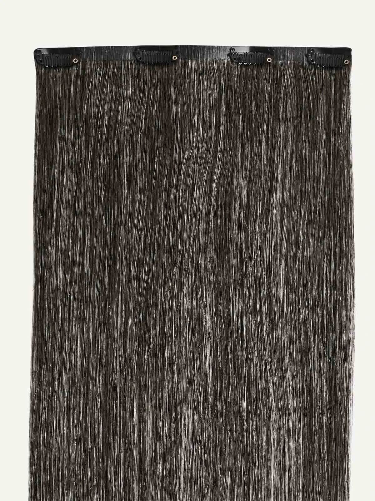 Best suited for short or thick hair, or a blunt cut, this Bundle includes a full 10-piece Seamless set and a single, Classic 4-clip Volumizer weft totaling 225 grams. An off black base with light gray strands, this neutral-toned salt and pepper shade lets you get back to your roots.