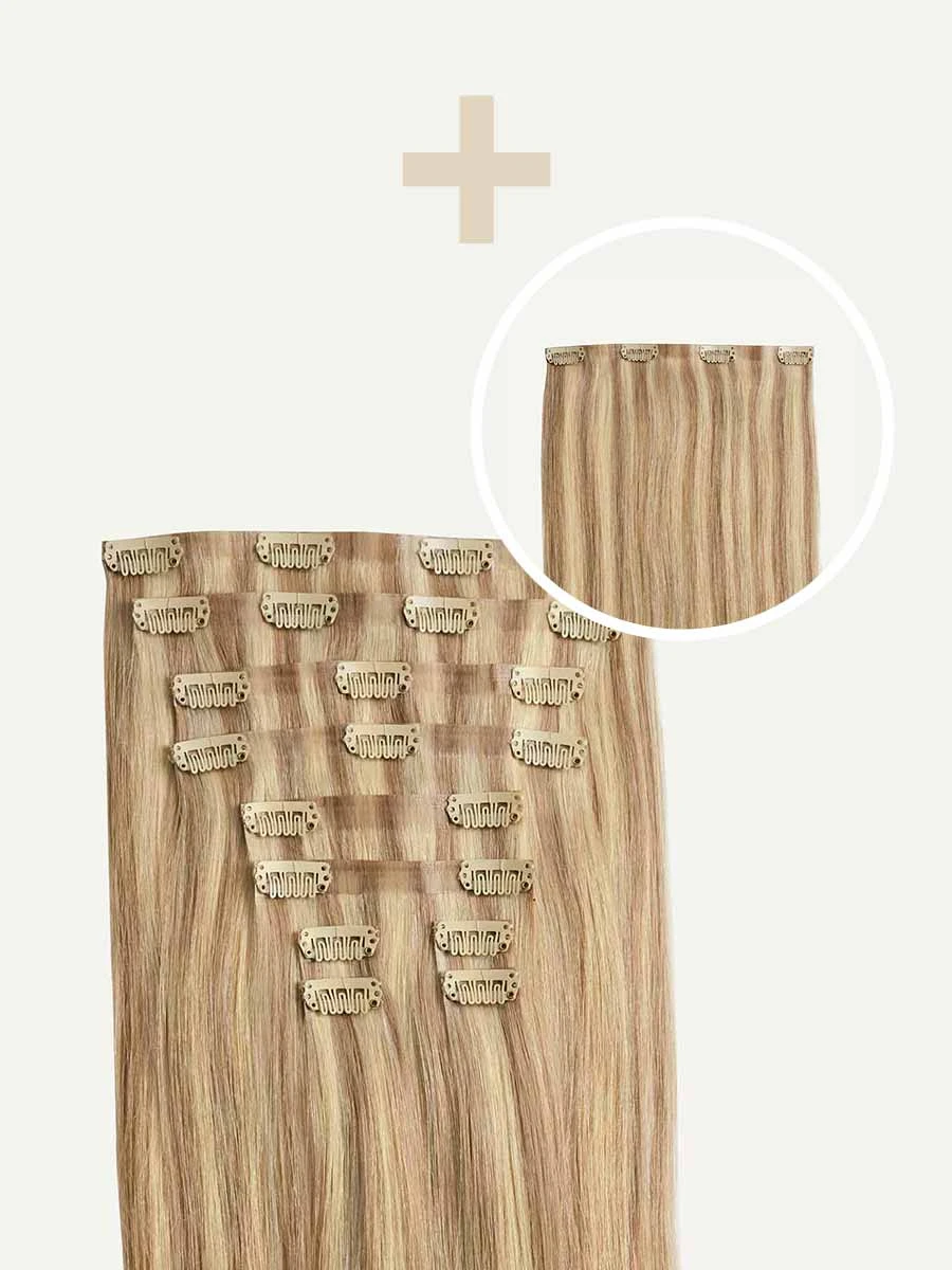Best suited for highlighted, short or thick hair, this Bundle includes a Seamless set and a single 4-clip Volumizer weft totaling 225 grams. Dirty Blonde Highlights is a Dirty Blonde base with Ash Blonde highlights, cool and warm hues create a multi-dimensional effect.