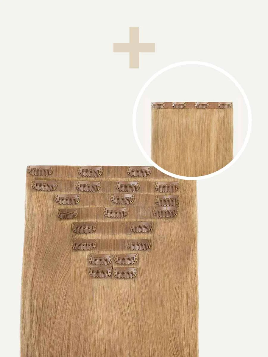 Best suited for short or thick hair, or a blunt cut, this Bundle includes a full 10-piece Seamless set and a single, Classic 4-clip Volumizer weft totaling 225 grams. One of our most popular colors, a mixture of warm blonde tones blend together in this multi-dimensional shade.