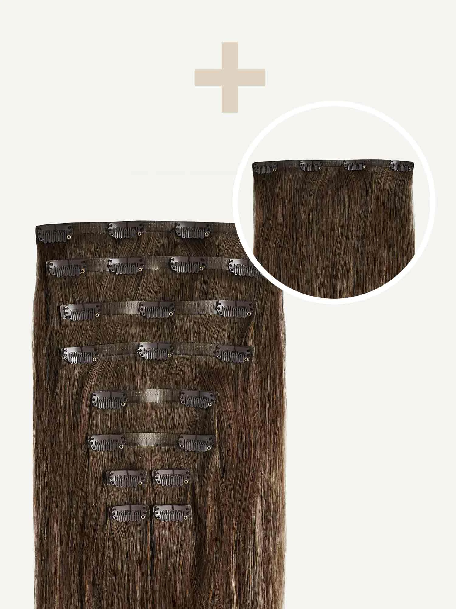 Best suited for short hair, very thick hair, or a blunt cut, this Volume Bundle includes a full 10-piece set and a single 4-clip Volumizer weft totaling 225 grams. A Neutral Brown base painted with Natural Blonde highlights, neutral and cool hues create a sun-kissed effect.