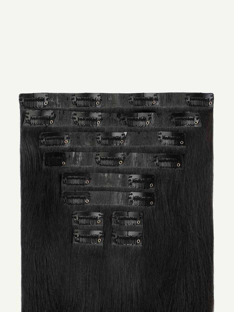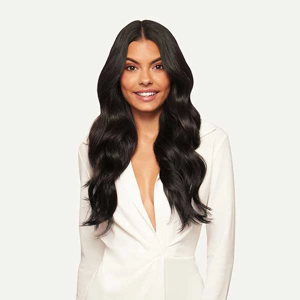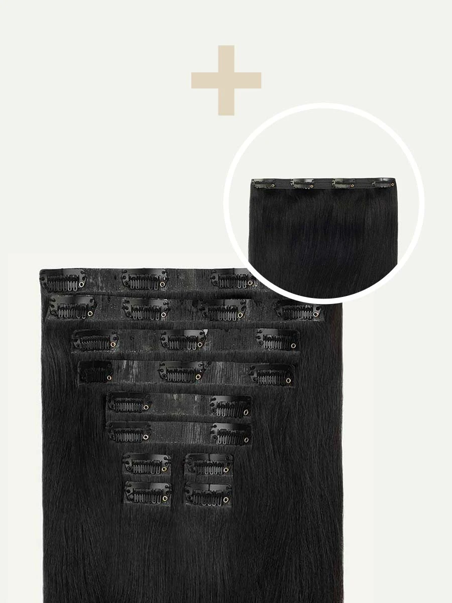 Best suited for short or thick hair, or a blunt cut, this Bundle includes a full 10-piece Seamless set and a single, Classic 4-clip Volumizer weft totaling 225 grams. A shade that’s just shy of Jet Black, warm brown undertones come together to create depth and complexity.