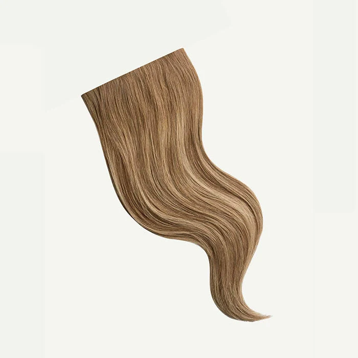 A Bronde base blended with painted Dirty Blonde highlights, warm blonde and brown hues create a sun-kissed effect.