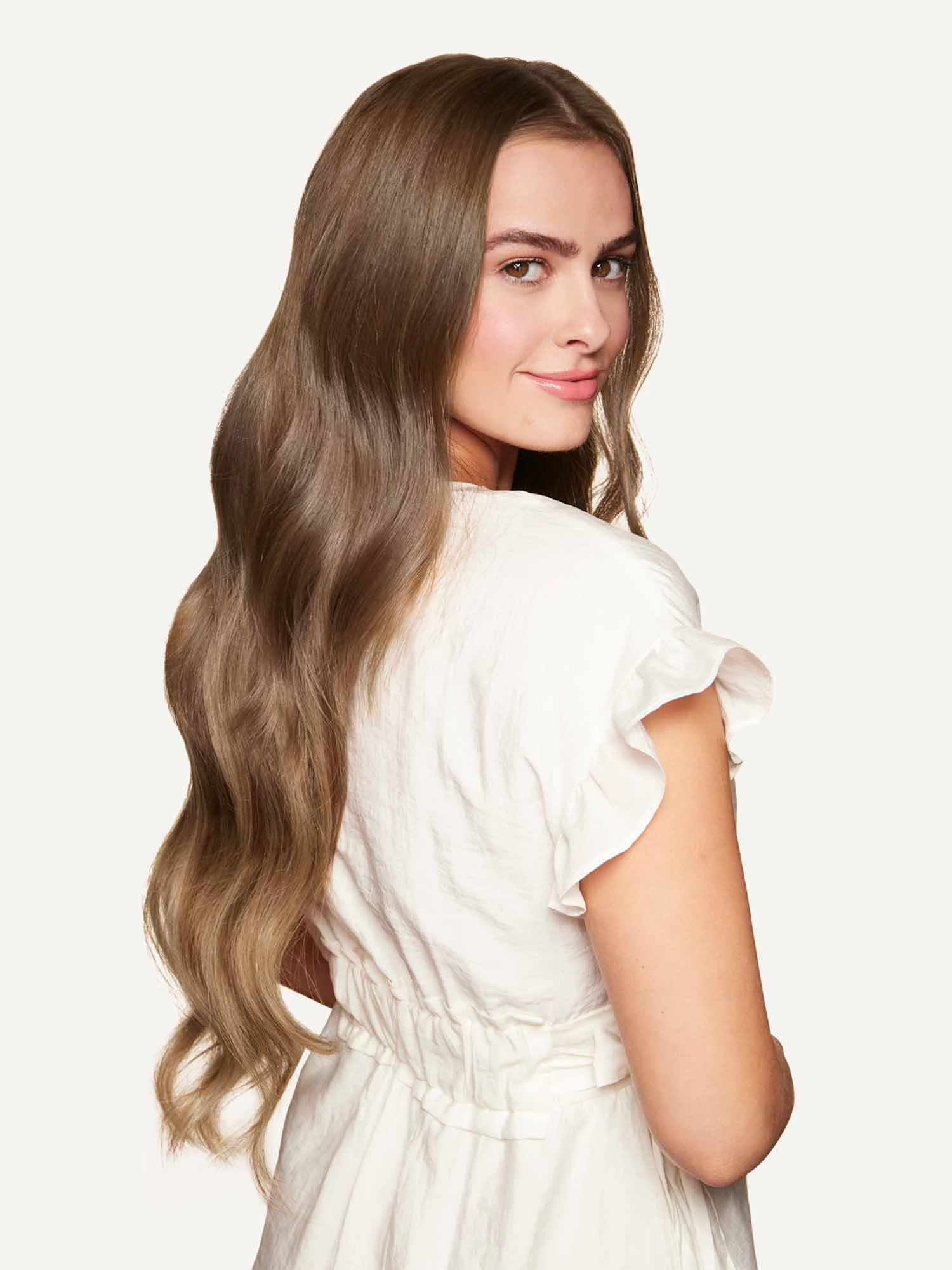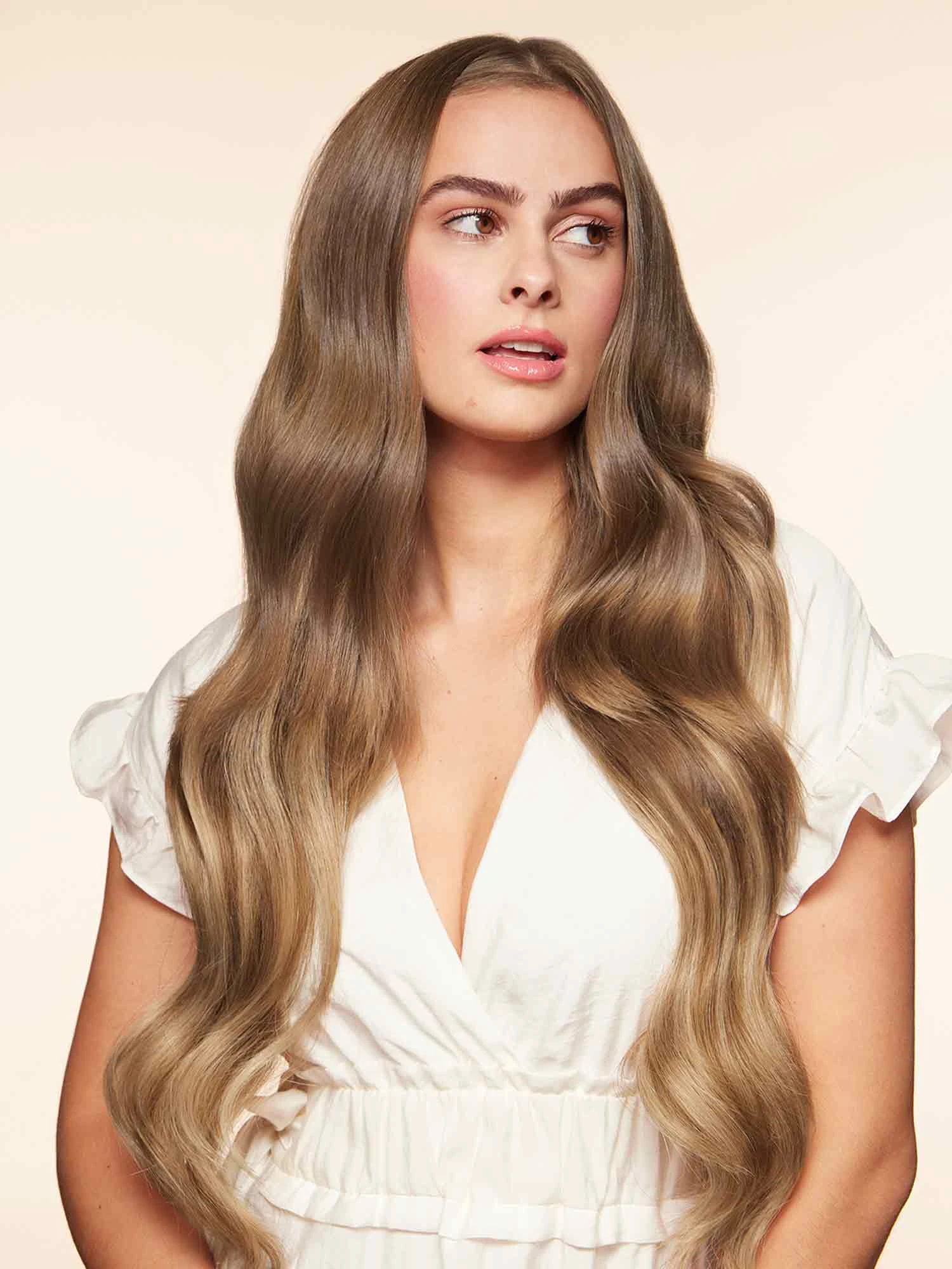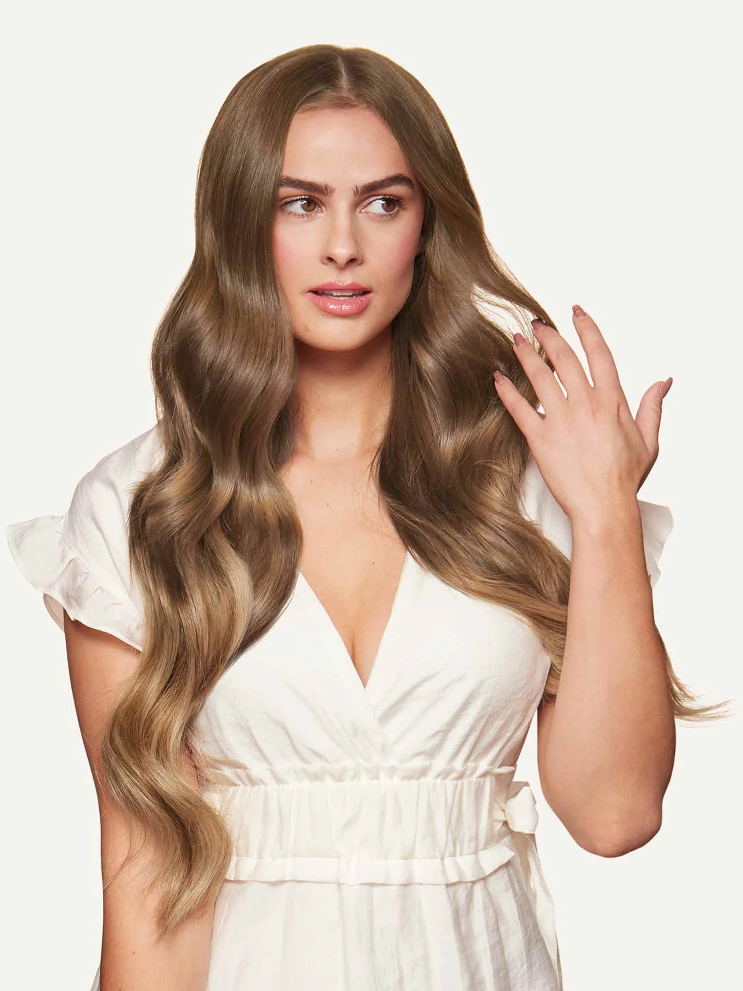 A Chestnut Brown base blended with painted Dirty Blonde highlights, warm golden hues create a sun-kissed effect.