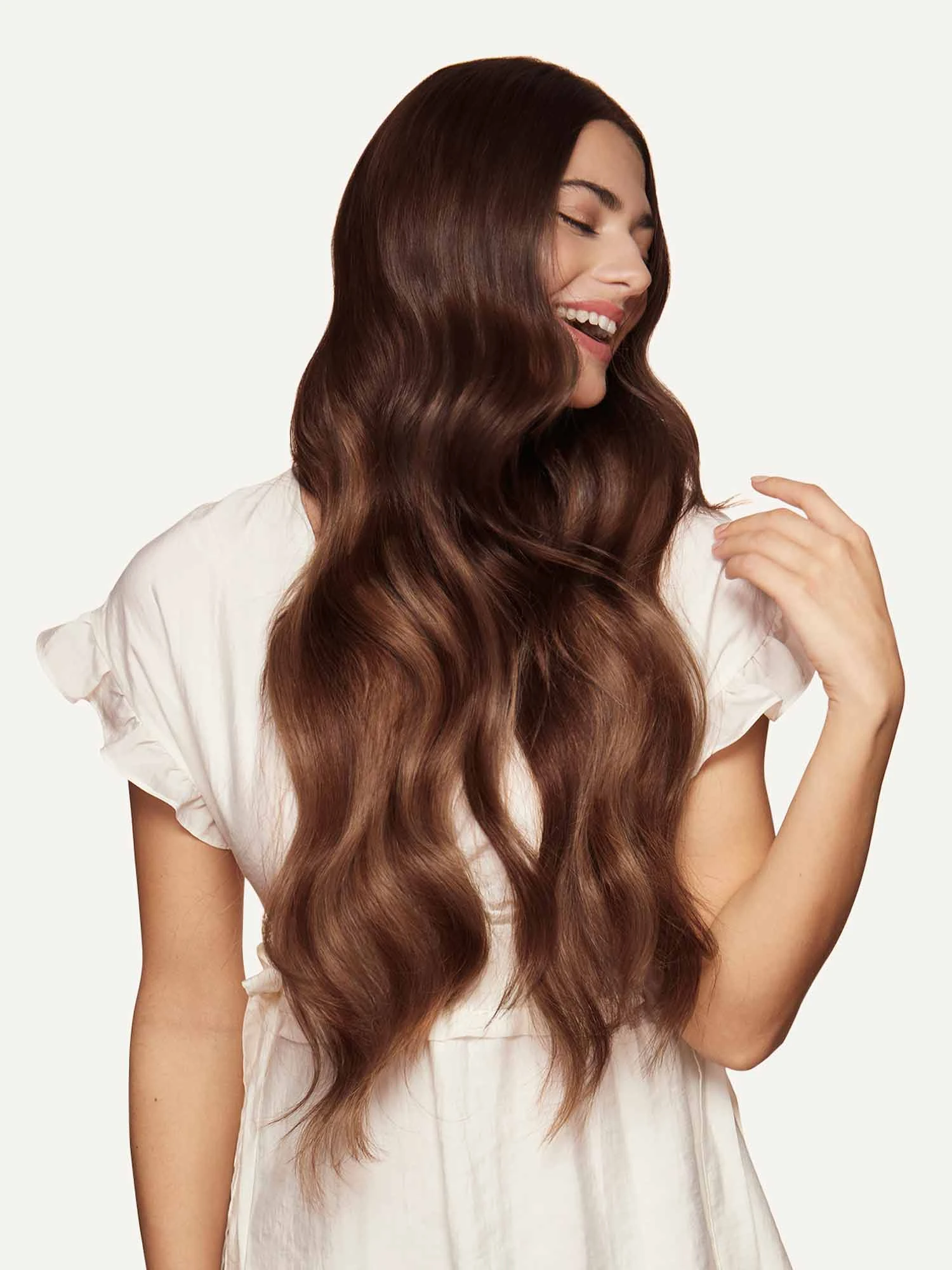 A Chocolate Brown base blended with painted Chestnut Brown highlights, warm golden hues and rich browns create a sun-kissed effect.