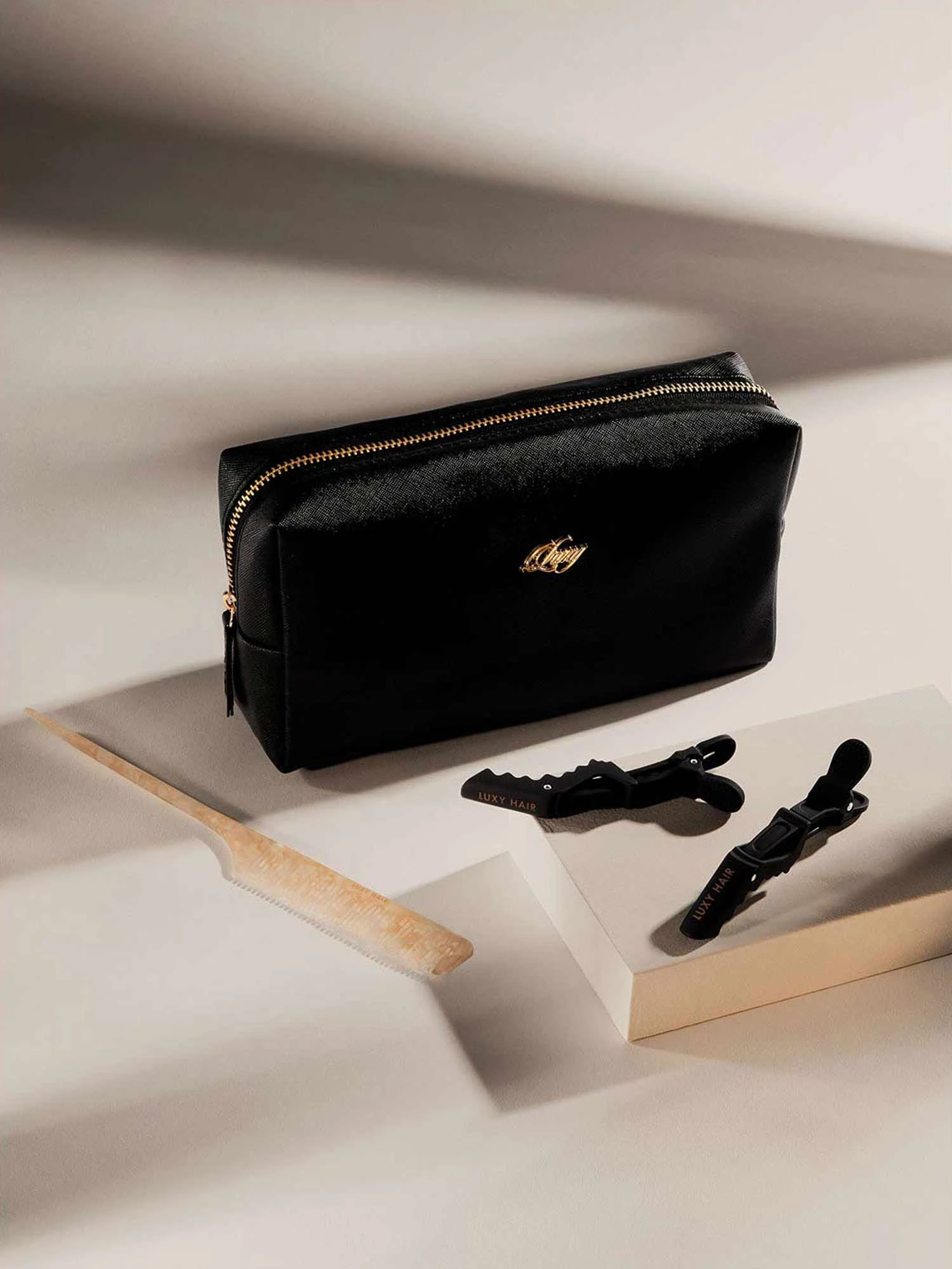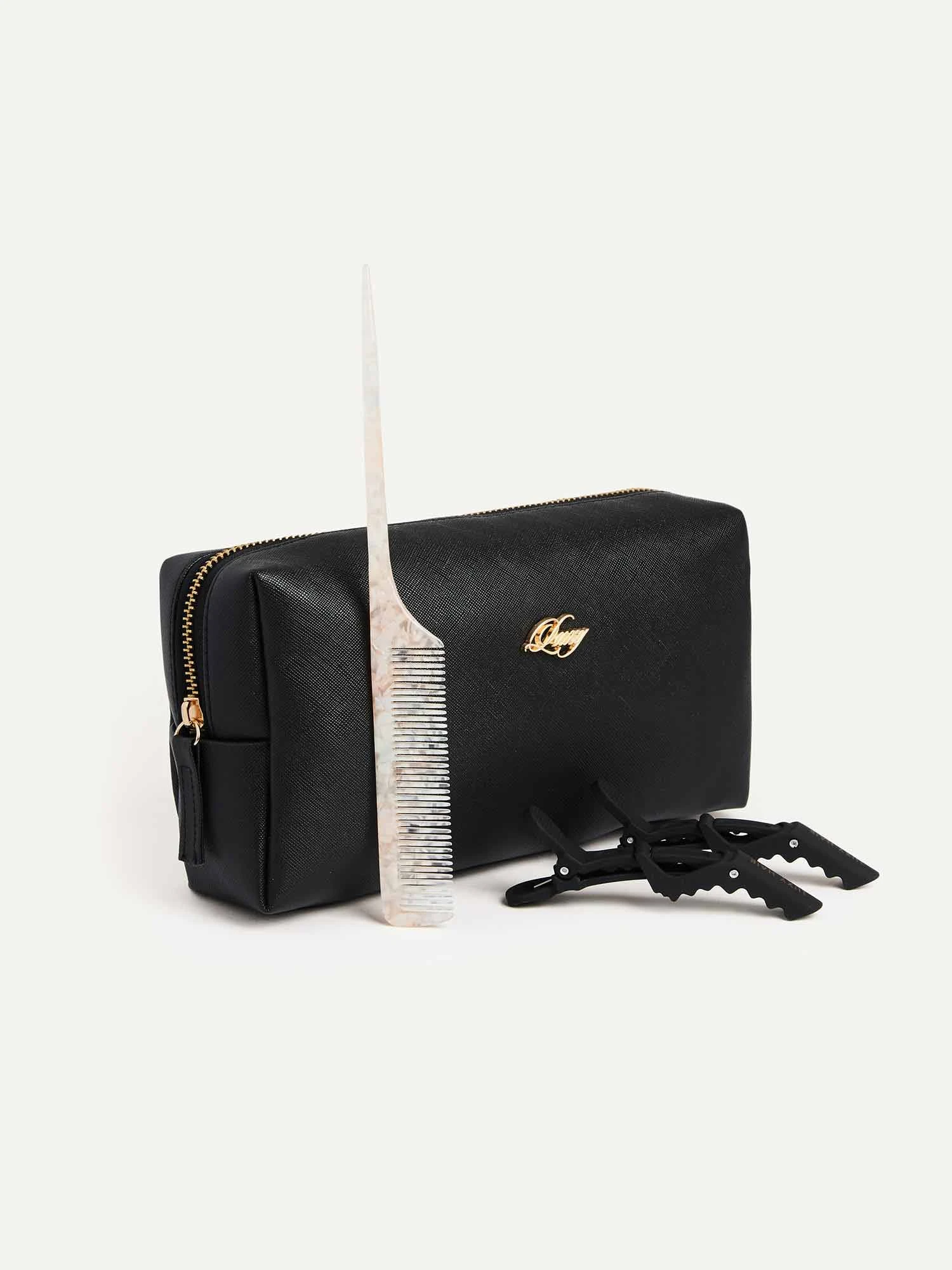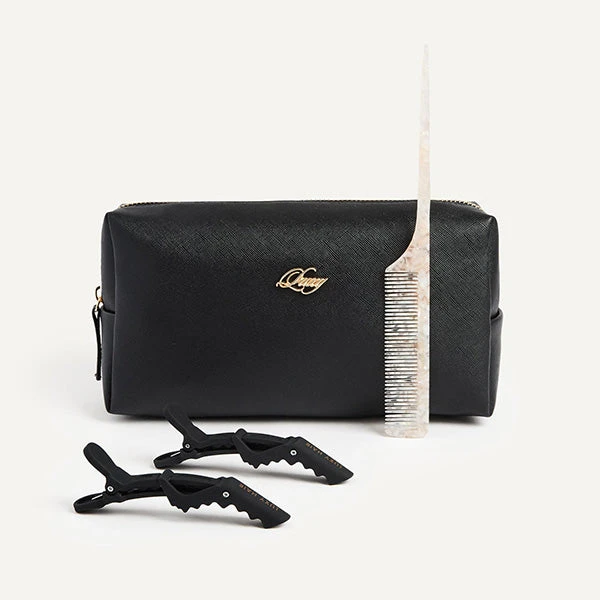 Section, clip, apply! Launch your routine into luxury with our Application Kit. This kit includes a Vegan Saffiano Leather Travel Bag, a pair of Matte Alligator Hair Clips, and a Pearlescent Rat Tail Comb for sectioning your hair while you clip in your extensions. All sales are final.